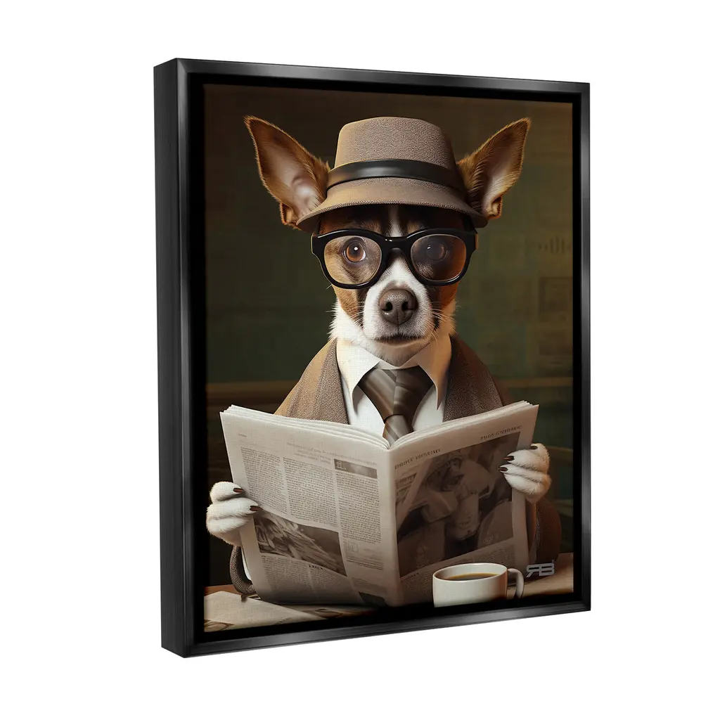 Elevate your home or office to the next level with Stupell Framed Floating Canvas Wall Art. Our premium hand-stretched canvas is mounted securely into a sturdy lightweight frame. The museum-style gap between the wrapped canvas and the box frame gives the illusion of floating artwork. Stupell Wall Art is made in the USA.Features: Dimensions: 17 x 1.7 x 21 Frame, 16 x 1.5 x 20 Canvas ArtFloating Frame Canvas Products are available in sizes 17"x21" and 25"x31". All Floating Frame Canvas Products have a 1.7" Depth.Wall Art is Ready to Hang with Hardware Free Hanging. No Installation required. For Easy Set Up Lean or Layer Artwork on Shelf or Against Wall. Artwork is Permently Fixed into the Frame.Our elevated 1.7" Thick Floating Frame is the perfect complement to our canvas style Wall Art. We use only the highest quality inks in house with industry leading printing solutions. Canvas is hand stretched over a durable wood foundation and then mounted securly into a Modern Box Frame. Made in the USA.Artwork Relates To: Reading, Animal, Canine, Dog, Mammal, Pet, Sunglasses, NewspaperDesign by RB