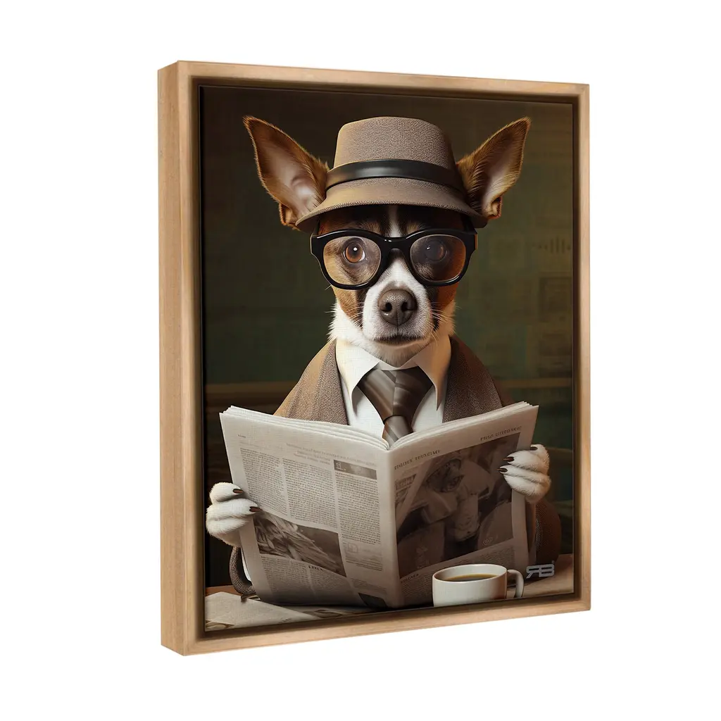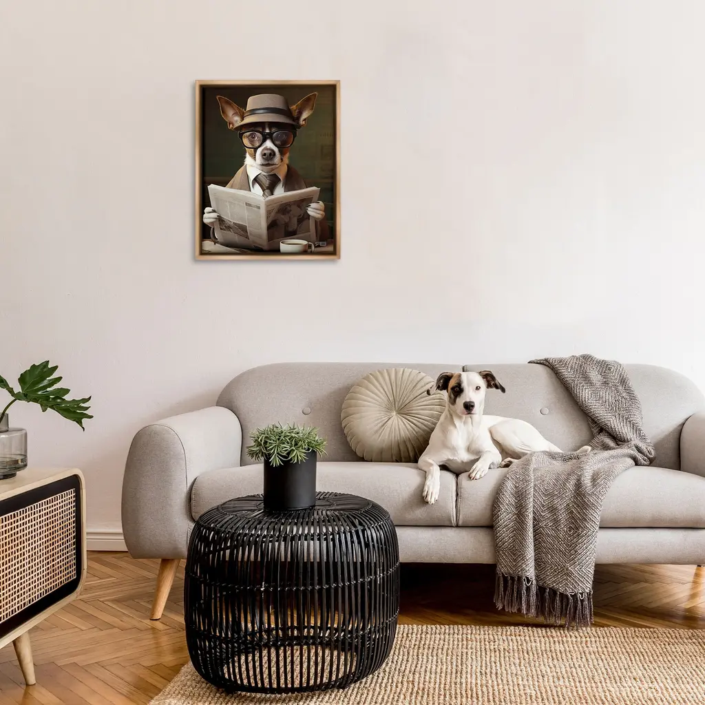Elevate your home or office to the next level with Stupell Framed Floating Canvas Wall Art. Our premium hand-stretched canvas is mounted securely into a sturdy lightweight frame. The museum-style gap between the wrapped canvas and the box frame gives the illusion of floating artwork. Stupell Wall Art is made in the USA.Features: Dimensions: 17 x 1.7 x 21 Frame, 16 x 1.5 x 20 Canvas ArtFloating Frame Canvas Products are available in sizes 17"x21" and 25"x31". All Floating Frame Canvas Products have a 1.7" Depth.Wall Art is Ready to Hang with Hardware Free Hanging. No Installation required. For Easy Set Up Lean or Layer Artwork on Shelf or Against Wall. Artwork is Permently Fixed into the Frame.Our elevated 1.7" Thick Floating Frame is the perfect complement to our canvas style Wall Art. We use only the highest quality inks in house with industry leading printing solutions. Canvas is hand stretched over a durable wood foundation and then mounted securly into a Modern Box Frame. Made in the USA.Artwork Relates To: Reading, Animal, Canine, Dog, Mammal, Pet, Sunglasses, NewspaperDesign by RB
