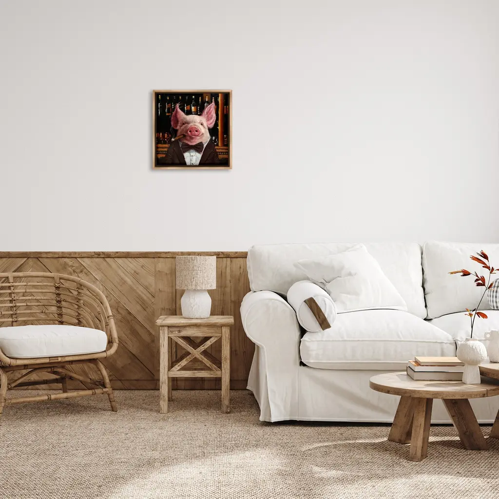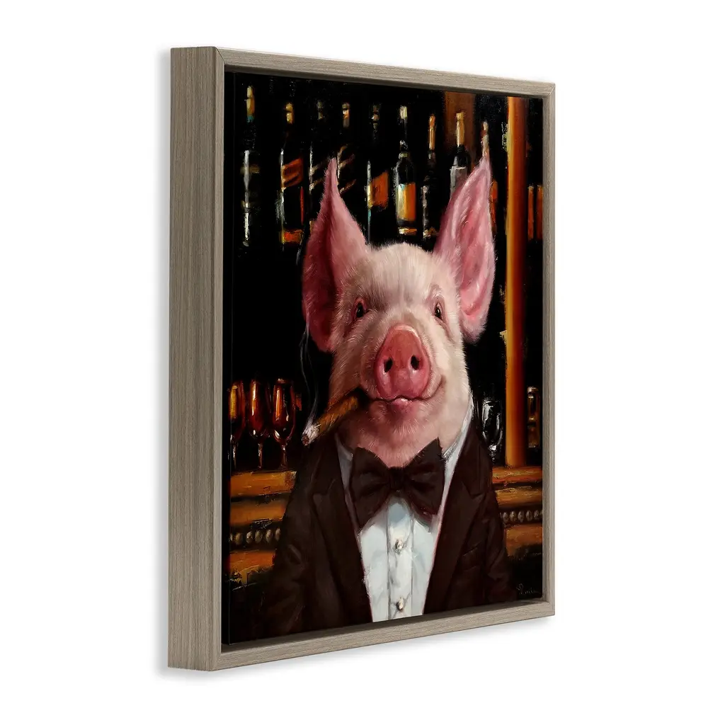 Elevate your home or office to the next level with Stupell Framed Floating Canvas Wall Art. Our premium hand-stretched canvas is mounted securely into a sturdy lightweight frame. The museum-style gap between the wrapped canvas and the box frame gives the illusion of floating artwork. Stupell Wall Art is made in the USA.Features: Dimensions: 18 x 1.7 x 18 Frame, 17 x 1.5 x 17 Canvas ArtFloating Frame Canvas Products are available in sizes 18"x18" and 25"x25". All Floating Frame Canvas Products have a 1.7" Depth.Wall Art is Ready to Hang with Hardware Free Hanging. No Installation required. For Easy Set Up Lean or Layer Artwork on Shelf or Against Wall. Artwork is Permently Fixed into the Frame.Our elevated 1.7" Thick Floating Frame is the perfect complement to our canvas style Wall Art. We use only the highest quality inks in house with industry leading printing solutions. Canvas is hand stretched over a durable wood foundation and then mounted securly into a Modern Box Frame. Made in the USA.Artwork Relates To: Animal, Pig, Humor, Bar, Cigar, Wine, TuxedoDesign by Lucia Heffernan