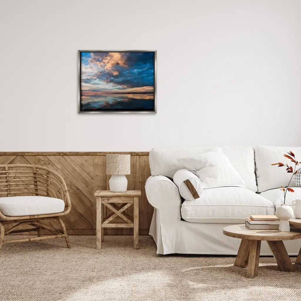 Elevate your home or office to the next level with Stupell Framed Floating Canvas Wall Art. Our premium hand-stretched canvas is mounted securely into a sturdy lightweight frame. The museum-style gap between the wrapped canvas and the box frame gives the illusion of floating artwork. Stupell Wall Art is made in the USA.Features: Dimensions: 21 x 1.7 x 17 Frame, 20 x 1.5 x 16 Canvas ArtFloating Frame Canvas Products are available in sizes 21"x17" and 31"x25". All Floating Frame Canvas Products have a 1.7" Depth.Wall Art is Ready to Hang with Hardware Free Hanging. No Installation required. For Easy Set Up Lean or Layer Artwork on Shelf or Against Wall. Artwork is Permently Fixed into the Frame.Our elevated 1.7" Thick Floating Frame is the perfect complement to our canvas style Wall Art. We use only the highest quality inks in house with industry leading printing solutions. Canvas is hand stretched over a durable wood foundation and then mounted securly into a Modern Box Frame. Made in the USA.Artwork Relates To: Nature, Sky, Cloud, Scenery, Weather, Horizon, Landscape, Sea, Water, Ocean, AbstractDesign by Emily Kalina