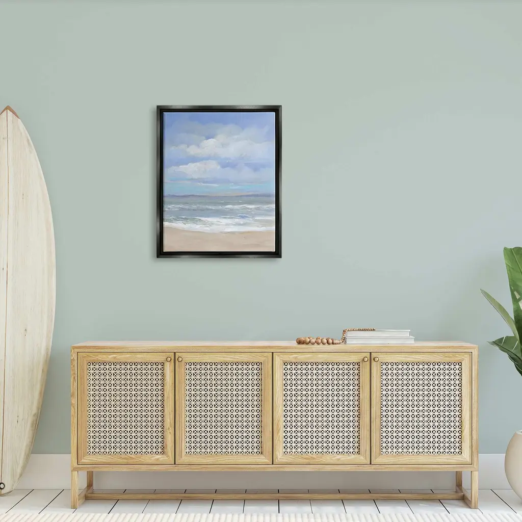 Elevate your home or office to the next level with Stupell Framed Floating Canvas Wall Art. Our premium hand stretched canvas is mounted securly into a sturdy lightweight frame. The museum style gap between wrapped canvas and box frame gives the illusion of floating artwork. Room Type: Living Room, Den, Hallway, Office, Entryway, Study, Dining Room or Bedroom, Guest Room, Studio, Dorm or BoudoirFeatures: Dimensions: 17 x 1.7 x 21 Frame, 16 x 1.5 x 20 Canvas ArtFloating Frame Sizes Include Standard: 17 x 1.7 x 21 Oversized: 25 x 1.7 x 31Wall Art is Ready to Hang - No Installation or Hardware Needed. For Easy Set Up Lean or Layer Artwork on Shelf or Against Wall.Our elevated 1.7" Thick Floating Frame is the perfect complement to our canvas style Wall Art. We use only the highest quality inks in house with industry leading printing solutions. Canvas is hand stretched over a durable wood foundation and then mounted securly into a Modern Box Frame. Made in the USA.Artwork Relates To: Beach, Coast, Nature, Outdoors, Sea, Shoreline, Water, Sky, CloudsDesign by Tim OToole