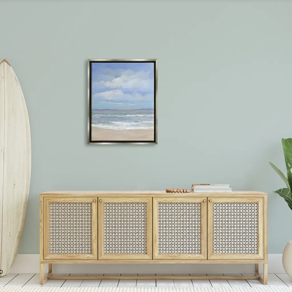 Elevate your home or office to the next level with Stupell Framed Floating Canvas Wall Art. Our premium hand stretched canvas is mounted securly into a sturdy lightweight frame. The museum style gap between wrapped canvas and box frame gives the illusion of floating artwork. Room Type: Living Room, Den, Hallway, Office, Entryway, Study, Dining Room or Bedroom, Guest Room, Studio, Dorm or BoudoirFeatures: Dimensions: 17 x 1.7 x 21 Frame, 16 x 1.5 x 20 Canvas ArtFloating Frame Sizes Include Standard: 17 x 1.7 x 21 Oversized: 25 x 1.7 x 31Wall Art is Ready to Hang - No Installation or Hardware Needed. For Easy Set Up Lean or Layer Artwork on Shelf or Against Wall.Our elevated 1.7" Thick Floating Frame is the perfect complement to our canvas style Wall Art. We use only the highest quality inks in house with industry leading printing solutions. Canvas is hand stretched over a durable wood foundation and then mounted securly into a Modern Box Frame. Made in the USA.Artwork Relates To: Beach, Coast, Nature, Outdoors, Sea, Shoreline, Water, Sky, CloudsDesign by Tim OToole
