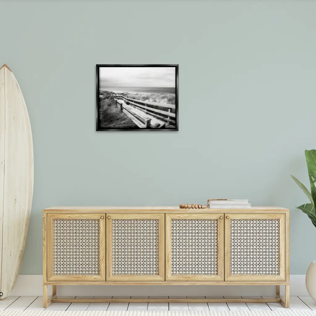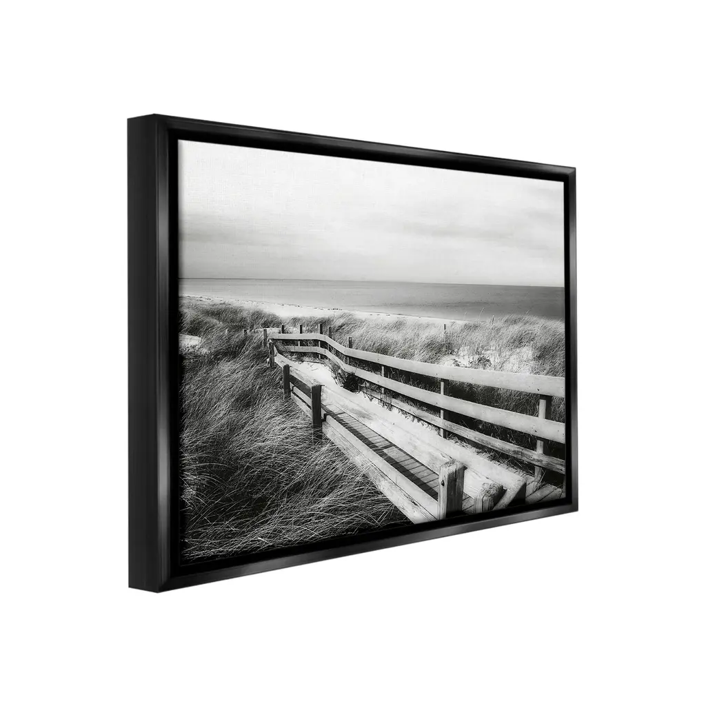 Elevate your home or office to the next level with Stupell Framed Floating Canvas Wall Art. Our premium hand-stretched canvas is mounted securely into a sturdy lightweight frame. The museum-style gap between the wrapped canvas and the box frame gives the illusion of floating artwork. Stupell Wall Art is made in the USA.Features: Dimensions: 21 x 1.7 x 17 Frame, 20 x 1.5 x 16 Canvas ArtFloating Frame Canvas Products are available in sizes 21"x17" and 31"x25". All Floating Frame Canvas Products have a 1.7" Depth.Wall Art is Ready to Hang with Hardware Free Hanging. No Installation required. For Easy Set Up Lean or Layer Artwork on Shelf or Against Wall. Artwork is Permently Fixed into the Frame.Our elevated 1.7" Thick Floating Frame is the perfect complement to our canvas style Wall Art. We use only the highest quality inks in house with industry leading printing solutions. Canvas is hand stretched over a durable wood foundation and then mounted securly into a Modern Box Frame. Made in the USA.Artwork Relates To: Beach, Coast, Sea, Shoreline, Nautical, Shore, Boardwalk, Fence, Monochrome, PhotographyDesign by GraffiTee Studios