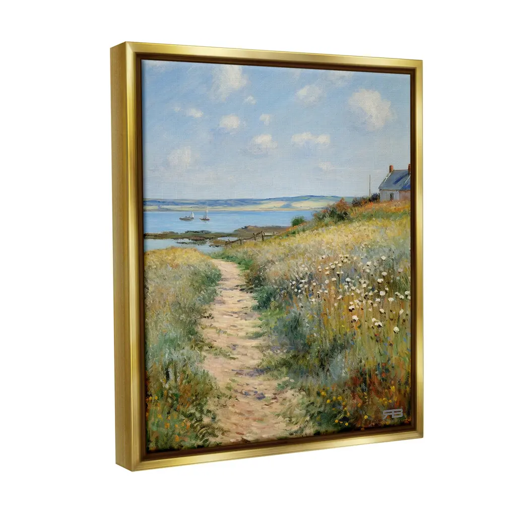 Elevate your home or office to the next level with Stupell Framed Floating Canvas Wall Art. Our premium hand-stretched canvas is mounted securely into a sturdy lightweight frame. The museum-style gap between the wrapped canvas and the box frame gives the illusion of floating artwork. Stupell Wall Art is made in the USA.Features: Dimensions: 17 x 1.7 x 21 Frame, 16 x 1.5 x 20 Canvas ArtFloating Frame Canvas Products are available in sizes 17"x21" and 25"x31". All Floating Frame Canvas Products have a 1.7" Depth.Wall Art is Ready to Hang with Hardware Free Hanging. No Installation required. For Easy Set Up Lean or Layer Artwork on Shelf or Against Wall. Artwork is Permently Fixed into the Frame.Our elevated 1.7" Thick Floating Frame is the perfect complement to our canvas style Wall Art. We use only the highest quality inks in house with industry leading printing solutions. Canvas is hand stretched over a durable wood foundation and then mounted securly into a Modern Box Frame. Made in the USA.Artwork Relates To: Painting, Path, Nature, Scenery, Landscape, Water, Shoreline, Grass, Plant, Cottage, House, Sea, Coast, Trail, Meadow, Beach, NauticalDesign by RB