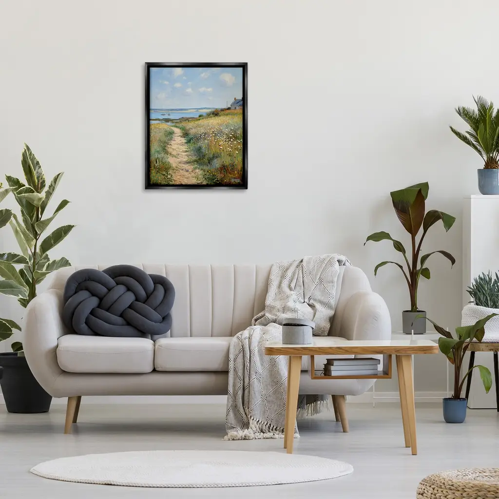 Elevate your home or office to the next level with Stupell Framed Floating Canvas Wall Art. Our premium hand-stretched canvas is mounted securely into a sturdy lightweight frame. The museum-style gap between the wrapped canvas and the box frame gives the illusion of floating artwork. Stupell Wall Art is made in the USA.Features: Dimensions: 17 x 1.7 x 21 Frame, 16 x 1.5 x 20 Canvas ArtFloating Frame Canvas Products are available in sizes 17"x21" and 25"x31". All Floating Frame Canvas Products have a 1.7" Depth.Wall Art is Ready to Hang with Hardware Free Hanging. No Installation required. For Easy Set Up Lean or Layer Artwork on Shelf or Against Wall. Artwork is Permently Fixed into the Frame.Our elevated 1.7" Thick Floating Frame is the perfect complement to our canvas style Wall Art. We use only the highest quality inks in house with industry leading printing solutions. Canvas is hand stretched over a durable wood foundation and then mounted securly into a Modern Box Frame. Made in the USA.Artwork Relates To: Painting, Path, Nature, Scenery, Landscape, Water, Shoreline, Grass, Plant, Cottage, House, Sea, Coast, Trail, Meadow, Beach, NauticalDesign by RB