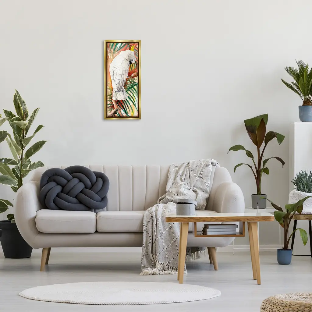 Elevate your home or office to the next level with Stupell Framed Floating Canvas Wall Art. Our premium hand-stretched canvas is mounted securely into a sturdy lightweight frame. The museum-style gap between the wrapped canvas and the box frame gives the illusion of floating artwork. Stupell Wall Art is made in the USA.Features: Dimensions: 11 x 1.7 x 25 Frame, 10 x 1.5 x 24 Canvas ArtFloating Frame Canvas Products are available in sizes 11"x25" and 14"x31". All Floating Frame Canvas Products have a 1.7" Depth.Wall Art is Ready to Hang with Hardware Free Hanging. No Installation required. For Easy Set Up Lean or Layer Artwork on Shelf or Against Wall. Artwork is Permently Fixed into the Frame.Our elevated 1.7" Thick Floating Frame is the perfect complement to our canvas style Wall Art. We use only the highest quality inks in house with industry leading printing solutions. Canvas is hand stretched over a durable wood foundation and then mounted securly into a Modern Box Frame. Made in the USA.Artwork Relates To: Animal, Bird, Parrot, Cockatoo, Cockatiel, Leaf, Plant, Botanical, Rainforest, NatureDesign by Christine Reichow