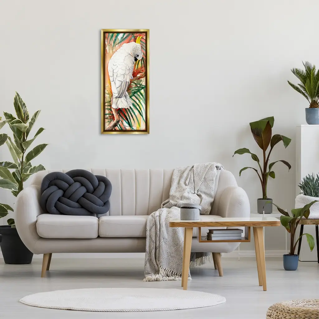 Elevate your home or office to the next level with Stupell Framed Floating Canvas Wall Art. Our premium hand-stretched canvas is mounted securely into a sturdy lightweight frame. The museum-style gap between the wrapped canvas and the box frame gives the illusion of floating artwork. Stupell Wall Art is made in the USA.Features: Dimensions: 11 x 1.7 x 25 Frame, 10 x 1.5 x 24 Canvas ArtFloating Frame Canvas Products are available in sizes 11"x25" and 14"x31". All Floating Frame Canvas Products have a 1.7" Depth.Wall Art is Ready to Hang with Hardware Free Hanging. No Installation required. For Easy Set Up Lean or Layer Artwork on Shelf or Against Wall. Artwork is Permently Fixed into the Frame.Our elevated 1.7" Thick Floating Frame is the perfect complement to our canvas style Wall Art. We use only the highest quality inks in house with industry leading printing solutions. Canvas is hand stretched over a durable wood foundation and then mounted securly into a Modern Box Frame. Made in the USA.Artwork Relates To: Animal, Bird, Parrot, Cockatoo, Cockatiel, Leaf, Plant, Botanical, Rainforest, NatureDesign by Christine Reichow