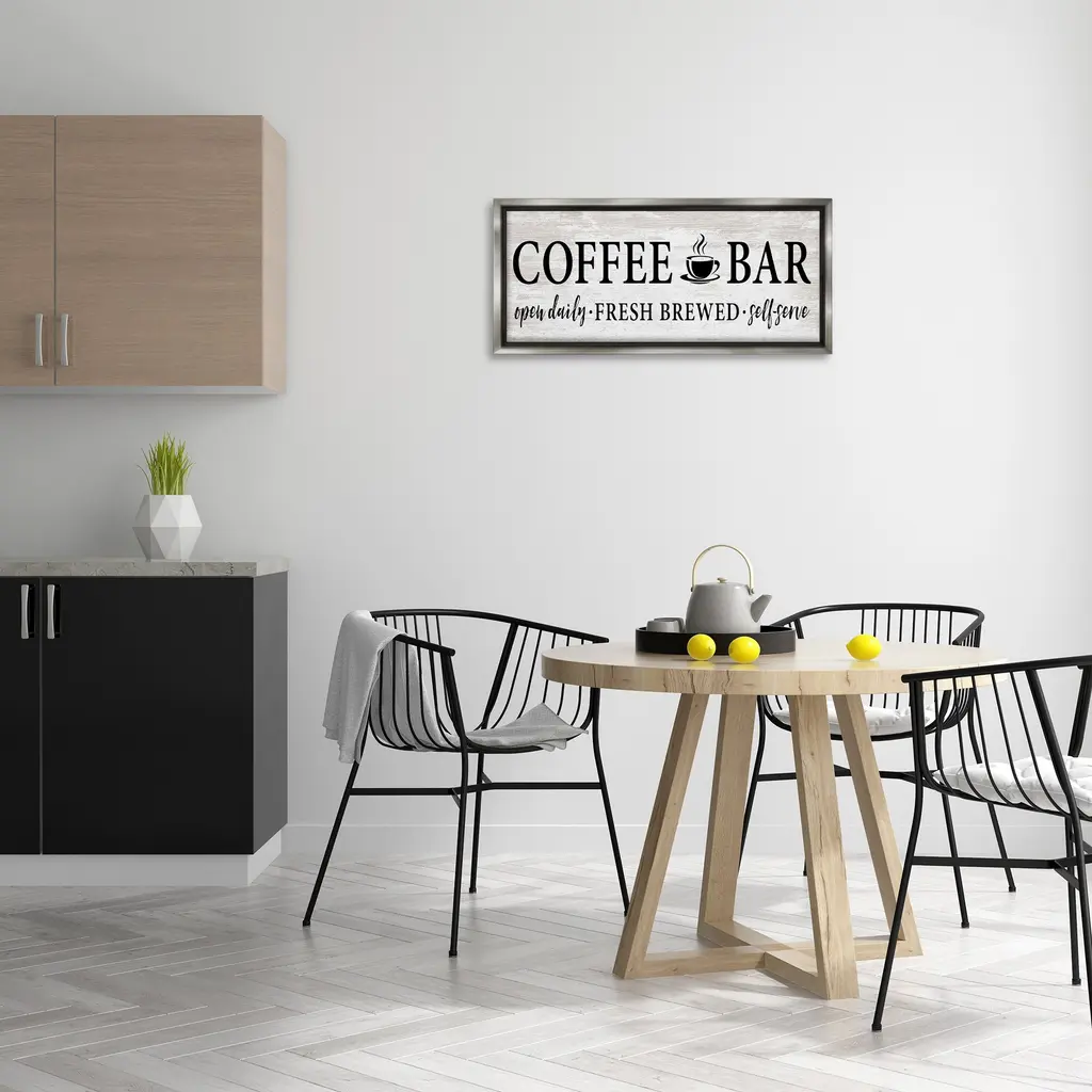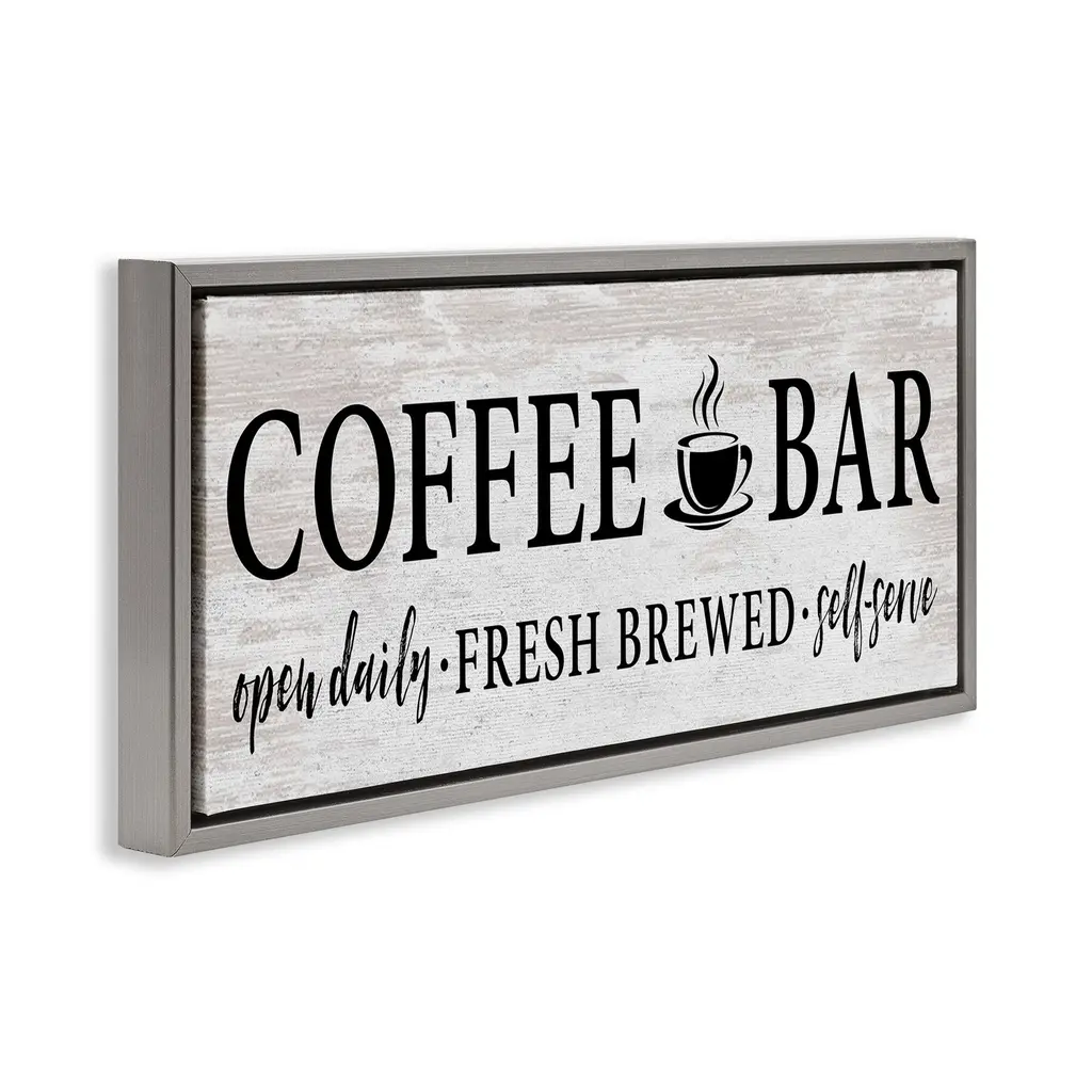 Elevate your home or office to the next level with Stupell Framed Floating Canvas Wall Art. Our premium hand-stretched canvas is mounted securely into a sturdy lightweight frame. The museum-style gap between the wrapped canvas and the box frame gives the illusion of floating artwork. Stupell Wall Art is made in the USA.Features: Dimensions: 25 x 1.7 x 11 Frame, 24 x 1.5 x 10 Canvas ArtFloating Frame Canvas Products are available in sizes 25"x11" and 31"x14". All Floating Frame Canvas Products have a 1.7" Depth.Wall Art is Ready to Hang with Hardware Free Hanging. No Installation required. For Easy Set Up Lean or Layer Artwork on Shelf or Against Wall. Artwork is Permently Fixed into the Frame.Our elevated 1.7" Thick Floating Frame is the perfect complement to our canvas style Wall Art. We use only the highest quality inks in house with industry leading printing solutions. Canvas is hand stretched over a durable wood foundation and then mounted securly into a Modern Box Frame. Made in the USA.Artwork Relates To: Kitchen, Rustic, Vintage, Coffee, MugDesign by Lettered and Lined