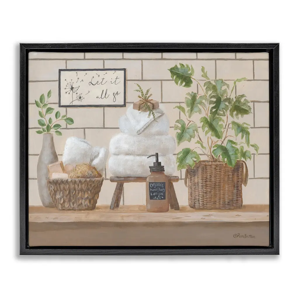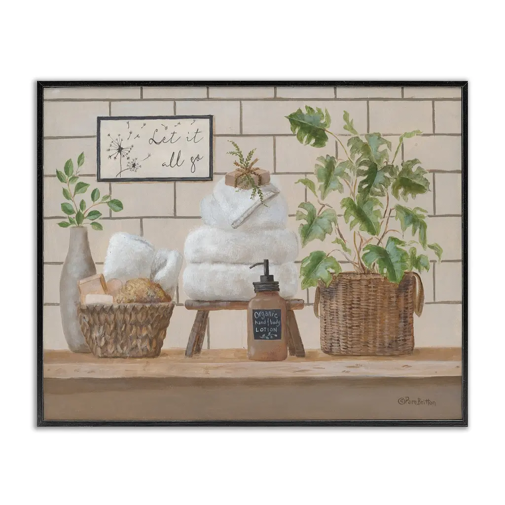 Our Framed Giclee Wall Art adds a touch of class to any space in your home or office. Frames are available in three alluring styles: black, gray farmhouse and white. Our textured artwork will add more depth and dimension to any space. Each piece is mounted with a 1.5 inch thick wood grain frame that is ready to hang! Looking for a statement piece? We have oversized artwork available.Features:Framed Giclee Sizes IncludeStandard: 14 x 1.5 x 11Large: 20 x 1.5 x 16Oversized: 30 x 1.5 x 24Wall Art is Ready to Hang - No Installation or Hardware Needed. For Easy Set Up Lean or Layer Artwork on Shelf or Against Wall.Artwork Relates To: Basket, Plant, Towel, Bath Towel, Indoors, Still Life, Let it all goOur giclee prints are carefully mounted on a durable MDF backing, and then perfectly finished in a 1.5 inch thick woodgrain frame. Mounted frame colors include black, gray farmhouse and white. Made In USA.Design by Pam Britton