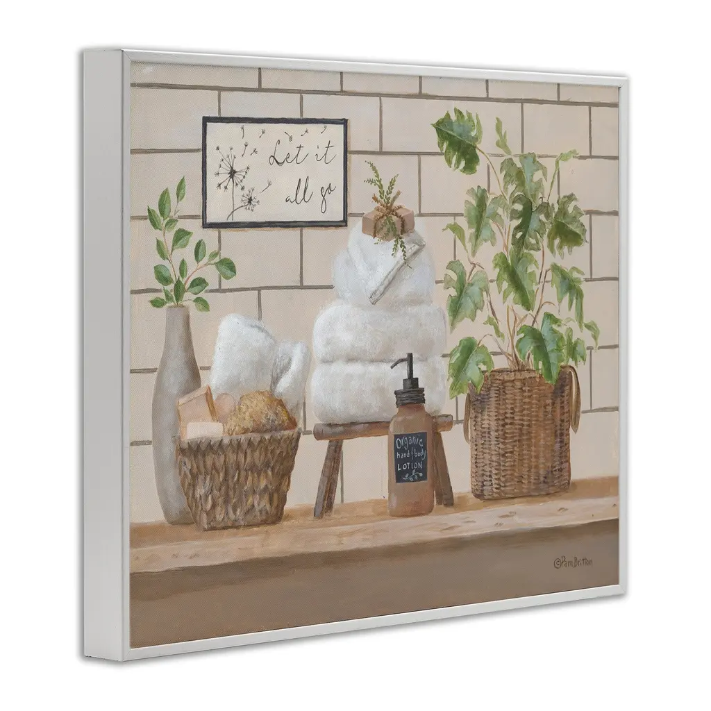 Our Framed Giclee Wall Art adds a touch of class to any space in your home or office. Frames are available in three alluring styles: black, gray farmhouse and white. Our textured artwork will add more depth and dimension to any space. Each piece is mounted with a 1.5 inch thick wood grain frame that is ready to hang! Looking for a statement piece? We have oversized artwork available.Features:Framed Giclee Sizes IncludeStandard: 14 x 1.5 x 11Large: 20 x 1.5 x 16Oversized: 30 x 1.5 x 24Wall Art is Ready to Hang - No Installation or Hardware Needed. For Easy Set Up Lean or Layer Artwork on Shelf or Against Wall.Artwork Relates To: Basket, Plant, Towel, Bath Towel, Indoors, Still Life, Let it all goOur giclee prints are carefully mounted on a durable MDF backing, and then perfectly finished in a 1.5 inch thick woodgrain frame. Mounted frame colors include black, gray farmhouse and white. Made In USA.Design by Pam Britton