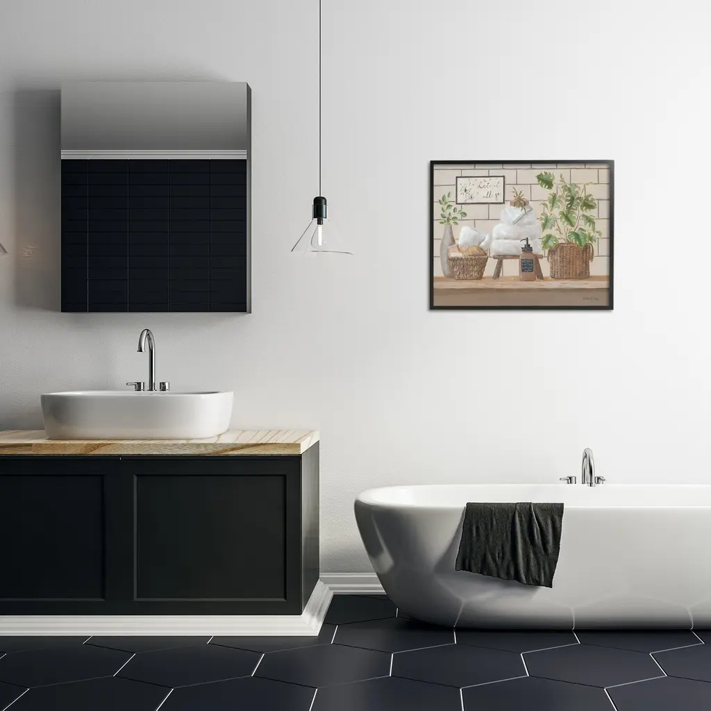 Our Framed Giclee Wall Art adds a touch of class to any space in your home or office. Frames are available in three alluring styles: black, gray farmhouse and white. Our textured artwork will add more depth and dimension to any space. Each piece is mounted with a 1.5 inch thick wood grain frame that is ready to hang! Looking for a statement piece? We have oversized artwork available.Features:Framed Giclee Sizes IncludeStandard: 14 x 1.5 x 11Large: 20 x 1.5 x 16Oversized: 30 x 1.5 x 24Wall Art is Ready to Hang - No Installation or Hardware Needed. For Easy Set Up Lean or Layer Artwork on Shelf or Against Wall.Artwork Relates To: Basket, Plant, Towel, Bath Towel, Indoors, Still Life, Let it all goOur giclee prints are carefully mounted on a durable MDF backing, and then perfectly finished in a 1.5 inch thick woodgrain frame. Mounted frame colors include black, gray farmhouse and white. Made In USA.Design by Pam Britton