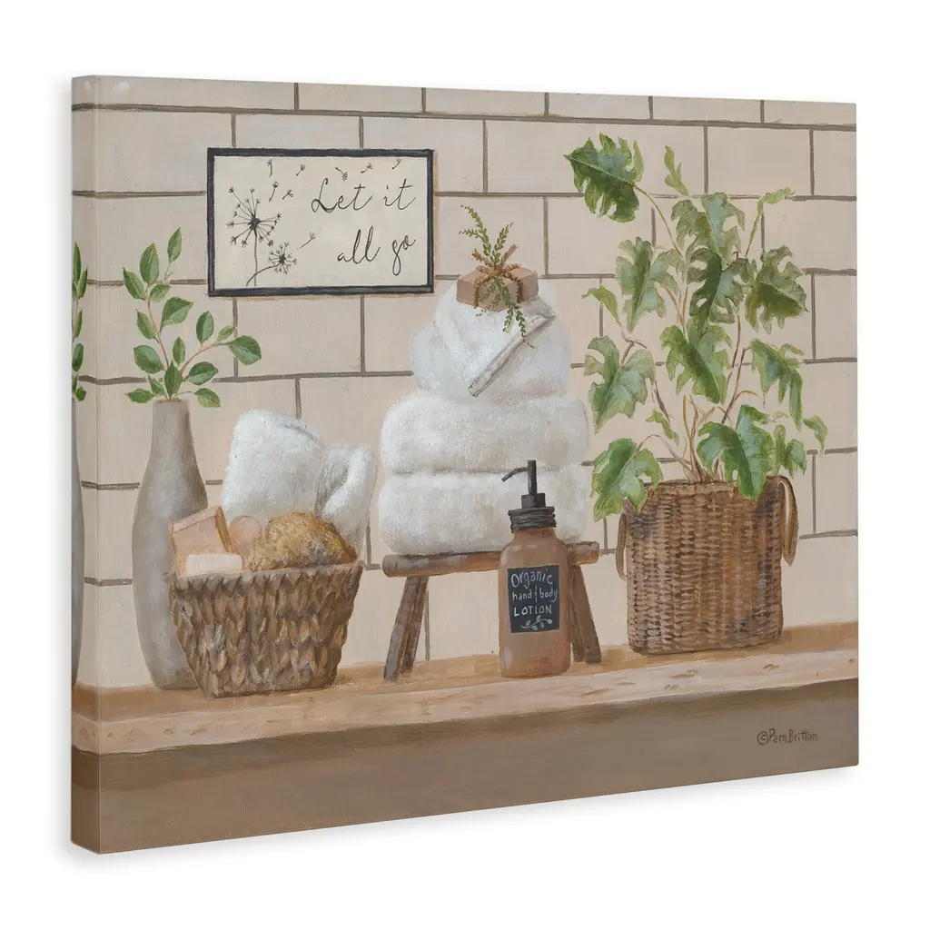 Proudly made in the USA, Our stretched canvas is created with the highest standards. We use only the highest quality inks and canvas on our in house Mimaki printers, and then hand cut and stretch each piece over a 1.5 inch thick wooden frame for hanging. The art comes ready to hang with no installation required. Not to mention, at this size, it is sure to be the focal point of any room!Features:Stretched Canvas Sizes IncludeStandard: 20 x 1.5 x 16Large: 30 x 1.5 x 20X-Large: 40 x 1.5 x 30Oversized: 48 x 1.5 x 36Wall Art is Ready to Hang - No Installation or Hardware Needed. For Easy Set Up Lean or Layer Artwork on Shelf or Against Wall.Artwork Relates To: Basket, Plant, Towel, Bath Towel, Indoors, Still Life, Let it all goOur stretched canvas is created with the highest standards. We use only the highest quality inks and canvas on our in house Mimaki printers, and then hand cut and stretch each piece over a 1.5 inch thick wooden frame for hanging. Made In USA.Design by Pam Britton