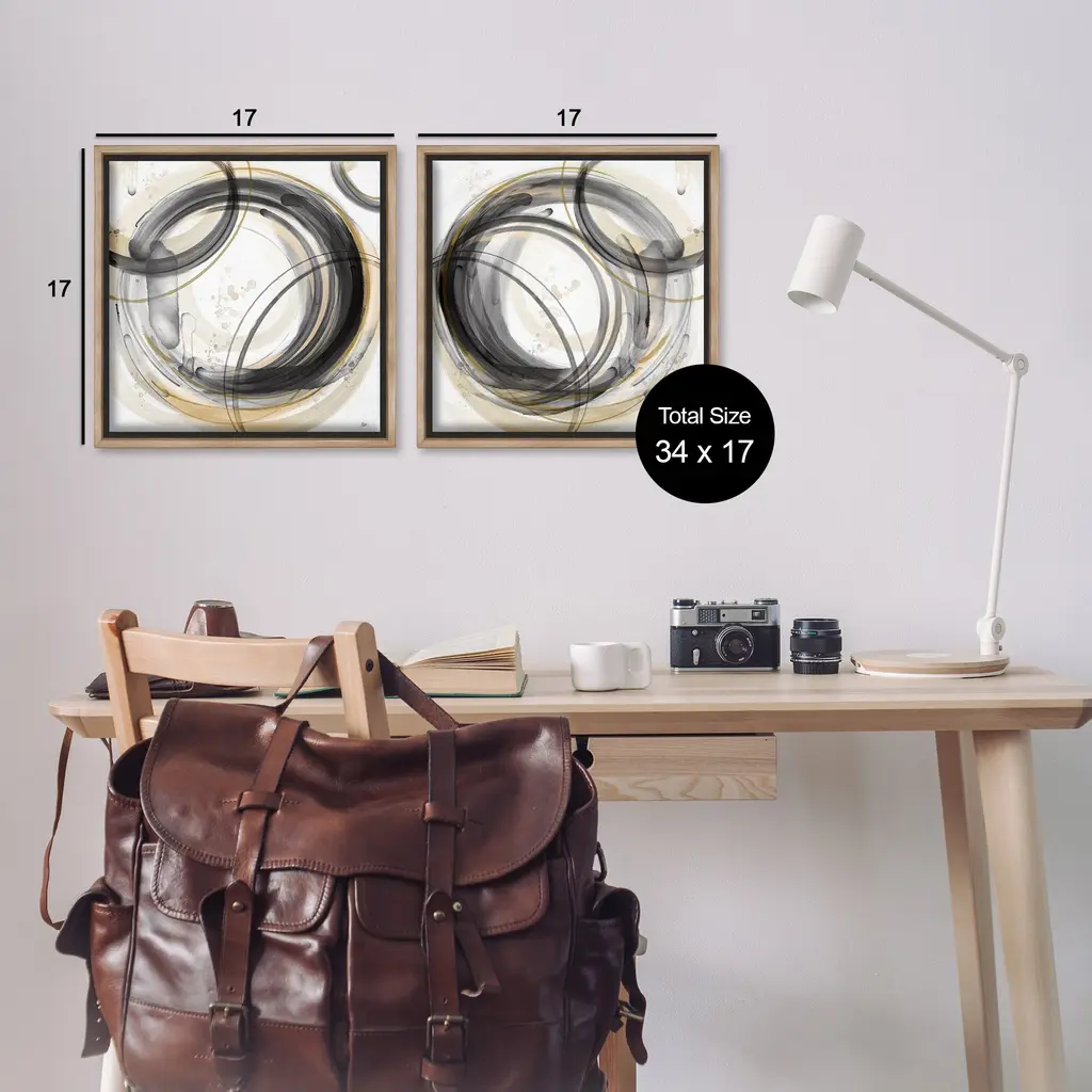 Elevate your home or office to the next level with Stupell Framed Floating Canvas Wall Art. Our premium hand-stretched canvas is mounted securely into a sturdy lightweight frame. The museum-style gap between the wrapped canvas and the box frame gives the illusion of floating artwork. Stupell Wall Art is made in the USA.Features: Dimensions: 2 Piece Set, Each Frame is 18 x 1.7 x 18Two Piece Floating Frame Canvas Products are available as 18"x18" or 25"x25" Panels. All Floating Frame Canvas Products have a 1.7" Depth.Wall Art is Ready to Hang with Hardware Free Hanging. No Installation required. For Easy Set Up Lean or Layer Artwork on Shelf or Against Wall. Artwork is Permently Fixed into the Frame.Our elevated 1.7" Thick Floating Frame is the perfect complement to our canvas style Wall Art. We use only the highest quality inks in house with industry leading printing solutions. Canvas is hand stretched over a durable wood foundation and then mounted securly into a Modern Box Frame. Made in the USA.Artwork Relates To: Abstract, Modern, Geometric, Circle, PatternDesign by Nan