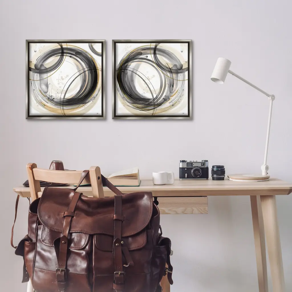 Elevate your home or office to the next level with Stupell Framed Floating Canvas Wall Art. Our premium hand-stretched canvas is mounted securely into a sturdy lightweight frame. The museum-style gap between the wrapped canvas and the box frame gives the illusion of floating artwork. Stupell Wall Art is made in the USA.Features: Dimensions: 2 Piece Set, Each Frame is 18 x 1.7 x 18Two Piece Floating Frame Canvas Products are available as 18"x18" or 25"x25" Panels. All Floating Frame Canvas Products have a 1.7" Depth.Wall Art is Ready to Hang with Hardware Free Hanging. No Installation required. For Easy Set Up Lean or Layer Artwork on Shelf or Against Wall. Artwork is Permently Fixed into the Frame.Our elevated 1.7" Thick Floating Frame is the perfect complement to our canvas style Wall Art. We use only the highest quality inks in house with industry leading printing solutions. Canvas is hand stretched over a durable wood foundation and then mounted securly into a Modern Box Frame. Made in the USA.Artwork Relates To: Abstract, Modern, Geometric, Circle, PatternDesign by Nan
