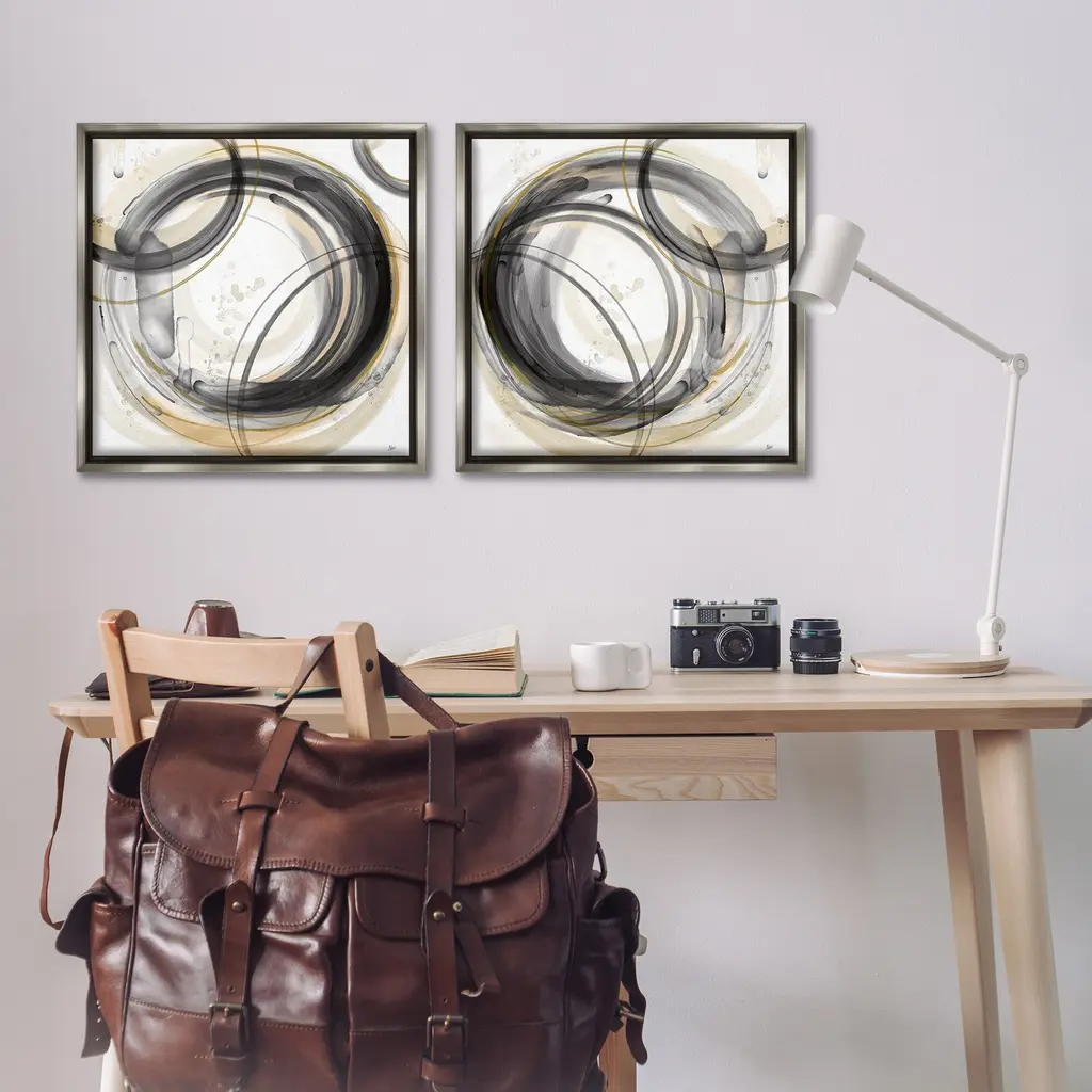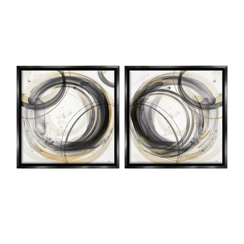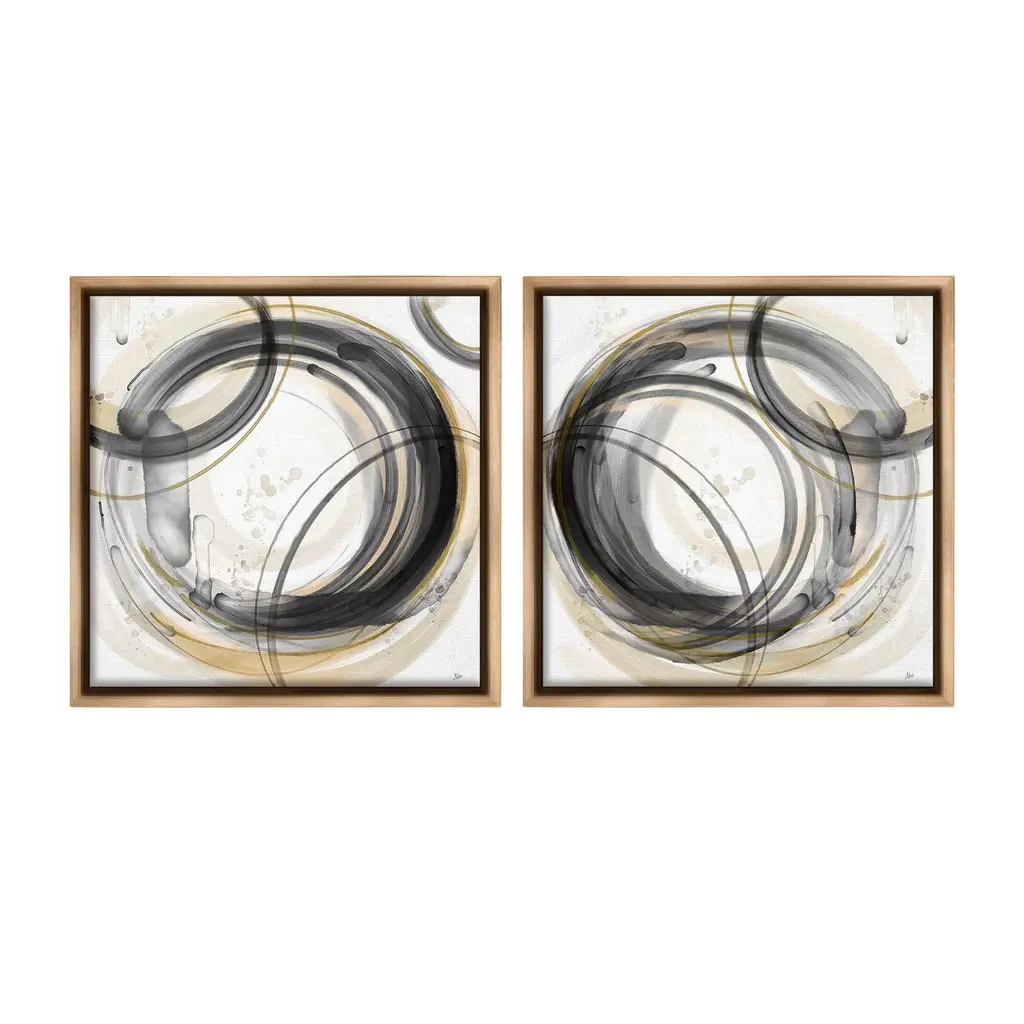 Elevate your home or office to the next level with Stupell Framed Floating Canvas Wall Art. Our premium hand-stretched canvas is mounted securely into a sturdy lightweight frame. The museum-style gap between the wrapped canvas and the box frame gives the illusion of floating artwork. Stupell Wall Art is made in the USA.Features: Dimensions: 2 Piece Set, Each Frame is 18 x 1.7 x 18Two Piece Floating Frame Canvas Products are available as 18"x18" or 25"x25" Panels. All Floating Frame Canvas Products have a 1.7" Depth.Wall Art is Ready to Hang with Hardware Free Hanging. No Installation required. For Easy Set Up Lean or Layer Artwork on Shelf or Against Wall. Artwork is Permently Fixed into the Frame.Our elevated 1.7" Thick Floating Frame is the perfect complement to our canvas style Wall Art. We use only the highest quality inks in house with industry leading printing solutions. Canvas is hand stretched over a durable wood foundation and then mounted securly into a Modern Box Frame. Made in the USA.Artwork Relates To: Abstract, Modern, Geometric, Circle, PatternDesign by Nan