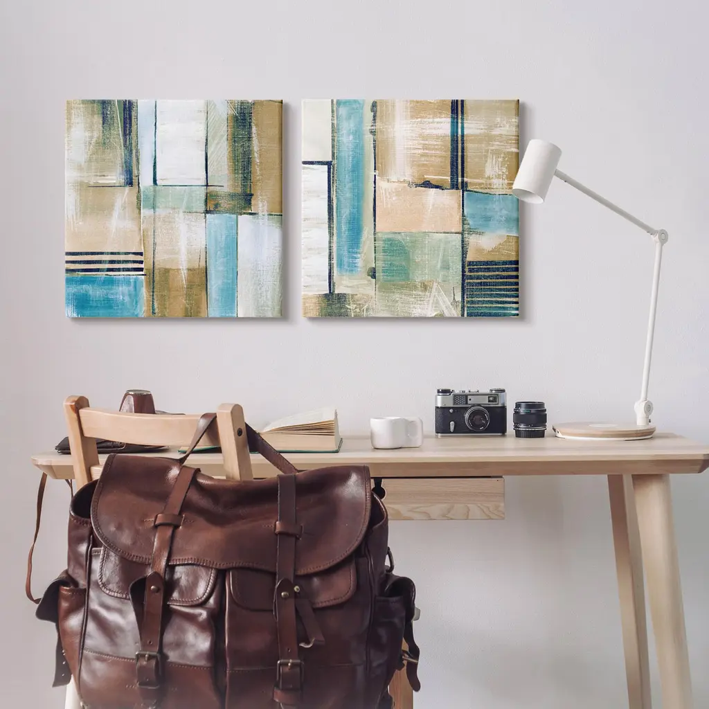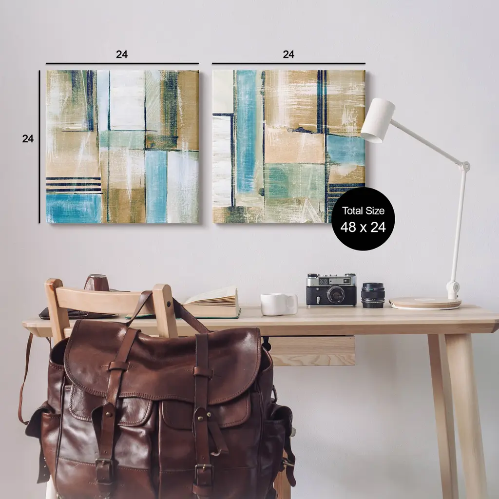 The more the better, right? Multi-Piece Canvas Sets help fill up the entire wall with excitement. Proudly made in the USA, Our stretched canvas is created with the highest standards. We use only the highest quality inks and canvas on our in house printers, and then hand cut and stretch each piece over a 1.5 inch thick wooden frame for hanging. The art comes ready to hang with no installation required.Features: Dimensions: 2 Piece Set, Each Panel is 17 x 1.5 x 17 InchesStretched Canvas Set Sizes Include Standard: 2pc, Each is 17 x 1.5 x 17 Large: 2pc, Eachis 24 x 1.5 x 24Wall Art is Ready to Hang - No Installation or Hardware Needed. For Easy Set Up Lean or Layer Artwork on Shelf or Against Wall.Our stretched canvas is created with the highest standards. We use only the highest quality inks and canvas on our in house Mimaki printers, and then hand cut and stretch each piece over a 1.5 inch thick wooden frame for hanging. Made In USA.Artwork Relates To: Modern, Contemporary, Abstract, GeometricDesign by Susan Jill