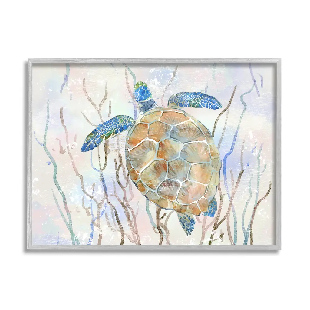 Stupell Contemporary Ocean Sea Turtle Abstract Kelp Sea Life Framed Wall Art - Blue - 30 X 24 - Black