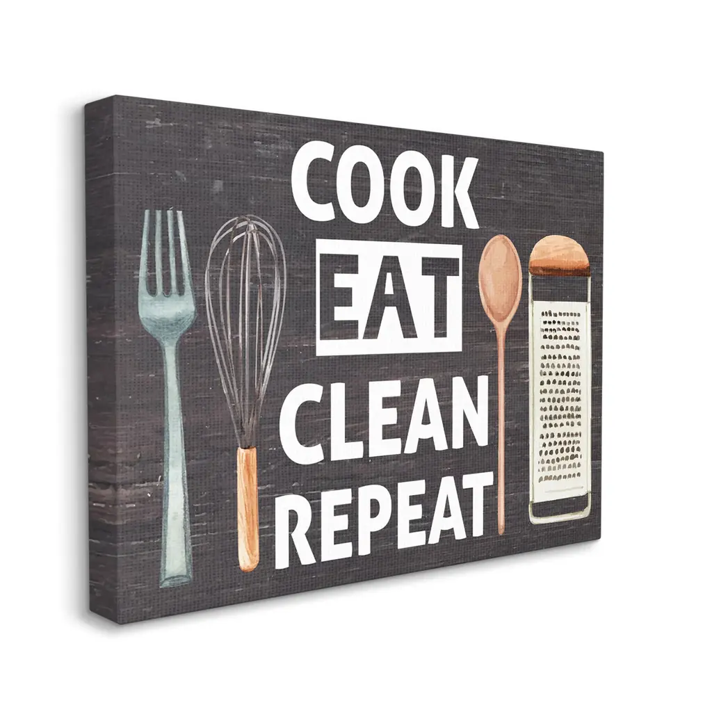 We create our stretched canvas to the highest standards. Using only the highest quality inks and canvas on Mimaki printers, we hand-cut and stretch each piece over a 1.5-inch thick wooden frame for hanging. As a result, the art comes ready to hang on the sturdy ledge with no installation required. Stupell Wall Art is made in the USA.Features: Dimensions: 20 x 1.5 x 16 InchesStretched Canvas Sizes Include Standard: 20 x 1.5 x 16 Large: 30 x 1.5 x 20 X-Large: 40 x 1.5 x 30 Oversized: 48 x 1.5 x 36Wall Art is Ready to Hang - No Installation or Hardware Needed. For Easy Set Up Lean or Layer Artwork on Shelf or Against Wall.Our stretched canvas is created with the highest standards. We use only the highest quality inks and canvas on our in house Mimaki printers, and then hand cut and stretch each piece over a 1.5 inch thick wooden frame for hanging. Made In USA.Artwork Relates To: Cutlery, Spoon, Fork, Kitchen Utensil, Grater, Kitchen, Cook Eat Clean RepeatDesign by ND Art
