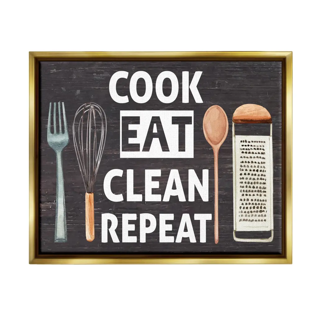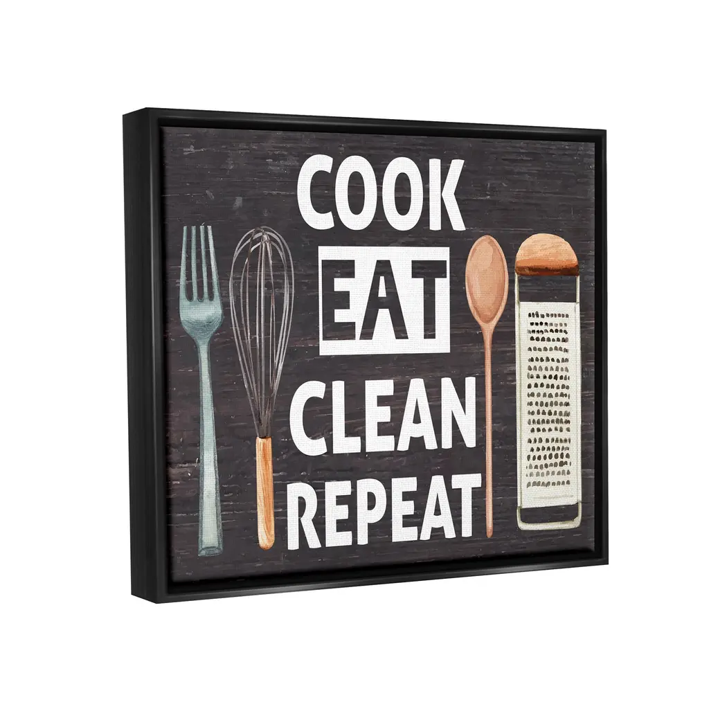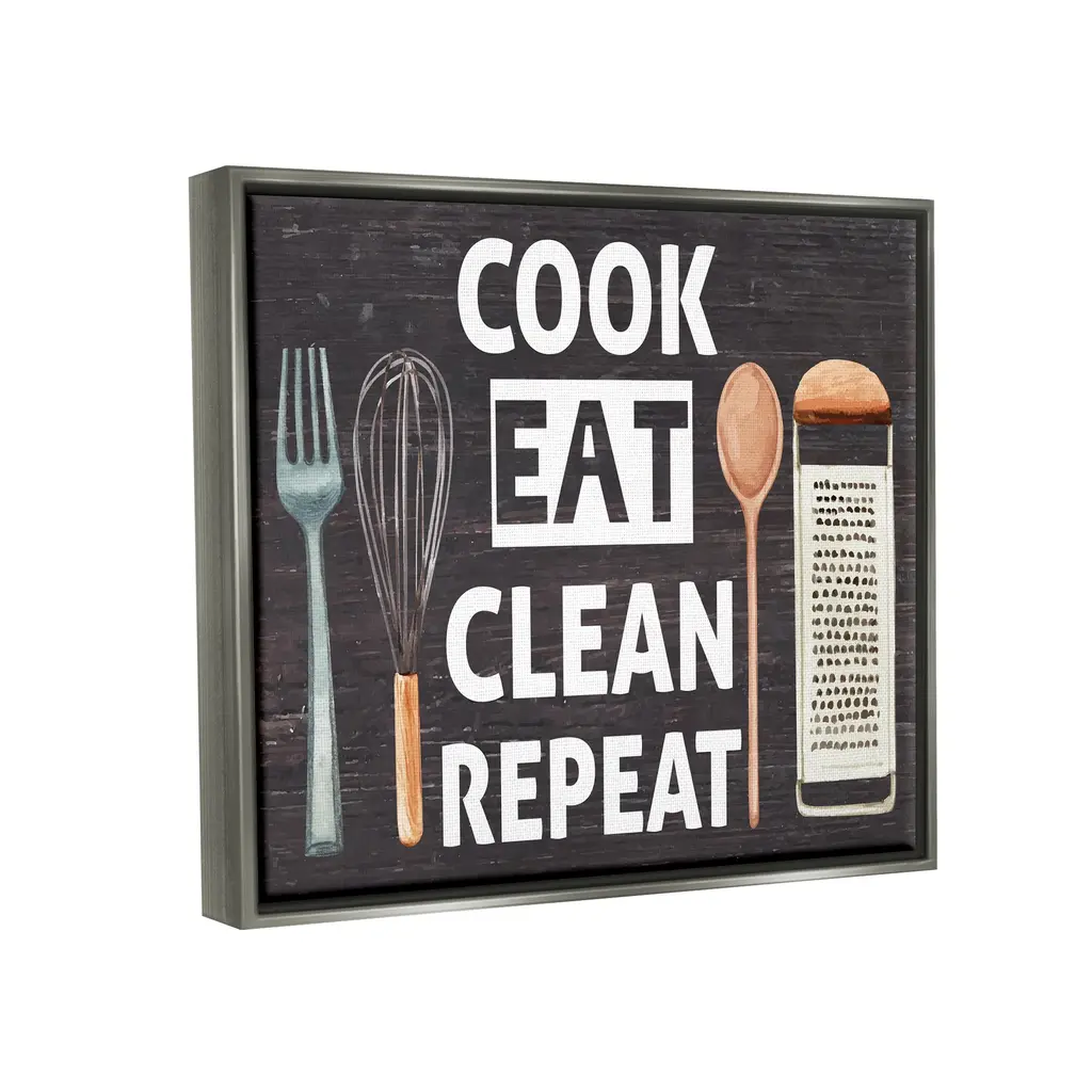 Elevate your home or office to the next level with Stupell Framed Floating Canvas Wall Art. Our premium hand-stretched canvas is mounted securely into a sturdy lightweight frame. The museum-style gap between the wrapped canvas and the box frame gives the illusion of floating artwork. Stupell Wall Art is made in the USA.Features: Dimensions: 21 x 1.7 x 17 Frame, 20 x 1.5 x 16 Canvas ArtFloating Frame Sizes Include Standard: 21 x 1.7 x 17 Oversized: 31 x 1.7 x 25Wall Art is Ready to Hang - No Installation or Hardware Needed. For Easy Set Up Lean or Layer Artwork on Shelf or Against Wall.Our elevated 1.7" Thick Floating Frame is the perfect complement to our canvas style Wall Art. We use only the highest quality inks in house with industry leading printing solutions. Canvas is hand stretched over a durable wood foundation and then mounted securly into a Modern Box Frame. Made in the USA.Artwork Relates To: Cutlery, Spoon, Fork, Kitchen Utensil, Grater, Kitchen, Cook Eat Clean RepeatDesign by ND Art
