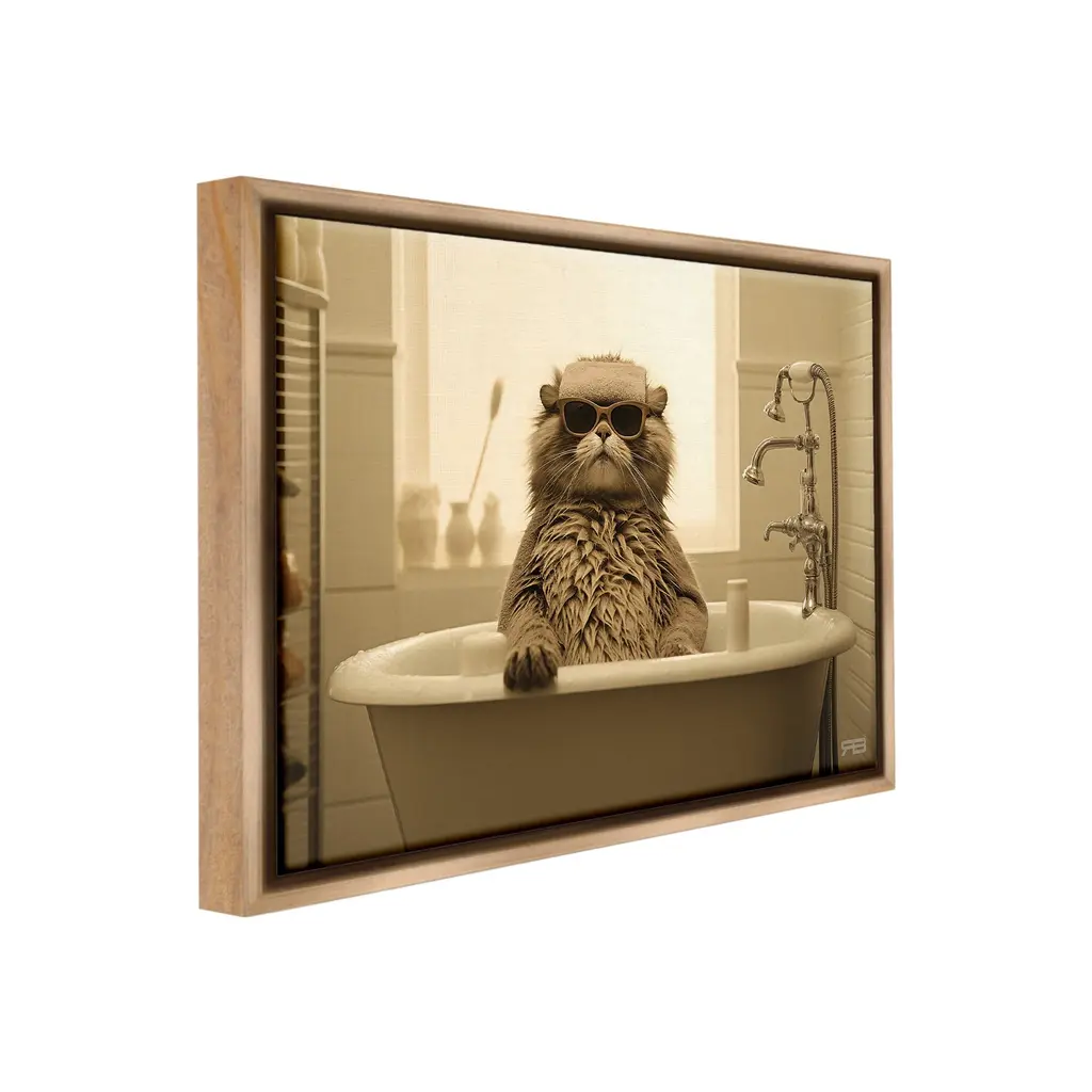 Elevate your home or office to the next level with Stupell Framed Floating Canvas Wall Art. Our premium hand-stretched canvas is mounted securely into a sturdy lightweight frame. The museum-style gap between the wrapped canvas and the box frame gives the illusion of floating artwork. Stupell Wall Art is made in the USA.Features: Dimensions: 21 x 1.7 x 17 Frame, 20 x 1.5 x 16 Canvas ArtFloating Frame Canvas Products are available in sizes 21"x17" and 31"x25". All Floating Frame Canvas Products have a 1.7" Depth.Wall Art is Ready to Hang with Hardware Free Hanging. No Installation required. For Easy Set Up Lean or Layer Artwork on Shelf or Against Wall. Artwork is Permently Fixed into the Frame.Our elevated 1.7" Thick Floating Frame is the perfect complement to our canvas style Wall Art. We use only the highest quality inks in house with industry leading printing solutions. Canvas is hand stretched over a durable wood foundation and then mounted securly into a Modern Box Frame. Made in the USA.Artwork Relates To: Tub, Bathing, Bathtub, Bathroom, Animal, Pet, CatDesign by RB