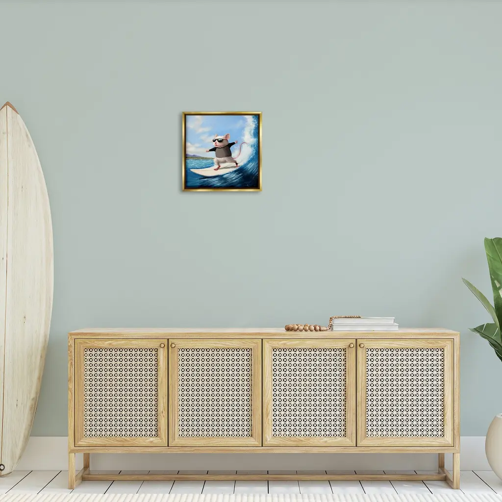 Stupell Cool Surfer Mouse Blue Ocean Waves Framed Floater Canvas Wall Art Design By Lucia Heffernan - 18 X 18 - Gold
