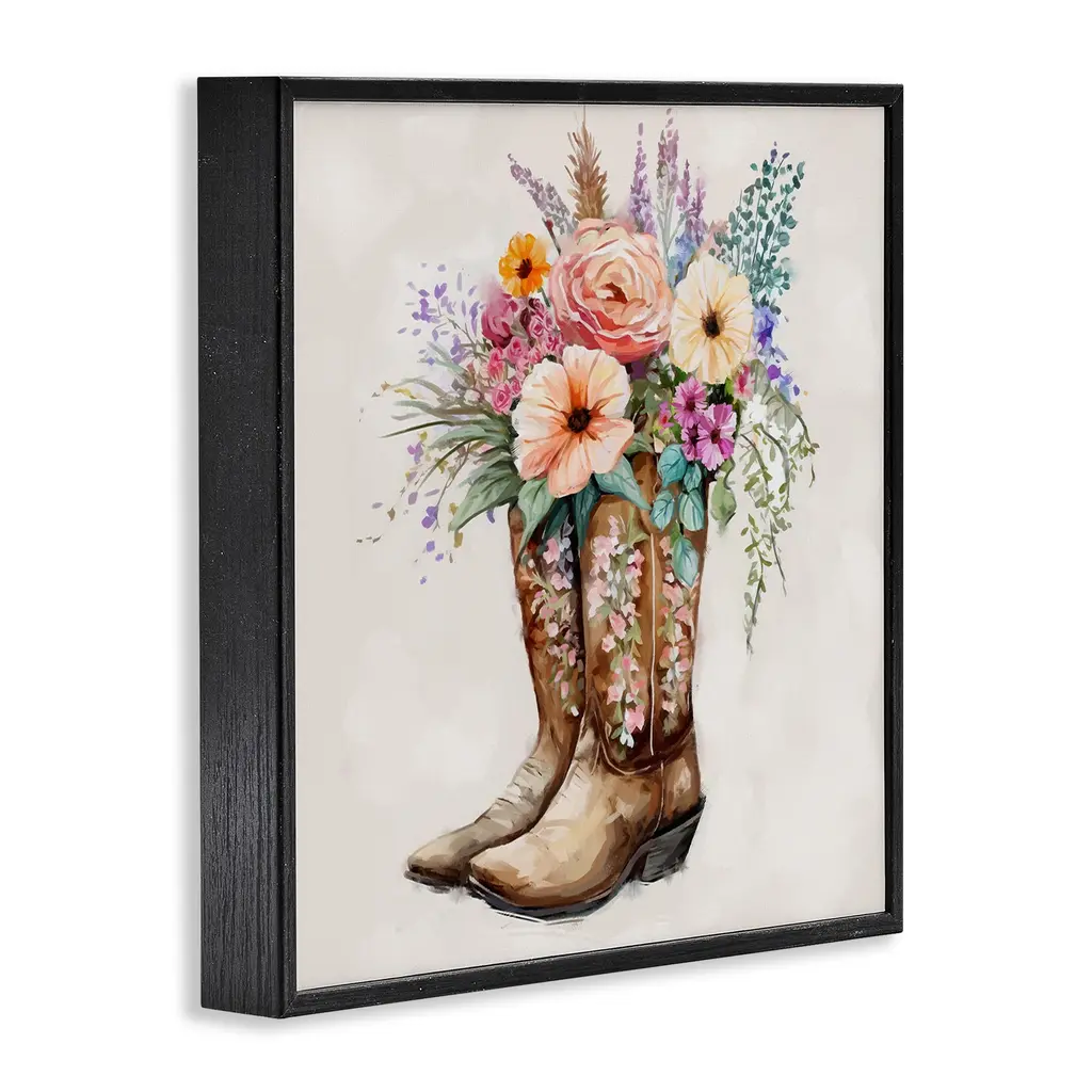 Add dimension to any room with our textured Framed Giclee Artwork. Our framed artwork is securely mounted into a 1.5-inch thick wood grain frame and ready to hang. Frames are available in three alluring styles: black, gray farmhouse and white. In addition, you should check out our oversized options if you want a statement piece. Stupell Wall Art is made in the USA.Features: Dimensions: 12 x 1.5 x 12 FramedFramed Giclee Sizes Include Standard: 12 x 1.5 x 12 Large: 17 x 1.5 x 17 Oversized: 24 x 1.5 x 24Wall Art is Ready to Hang - No Installation or Hardware Needed. For Easy Set Up Lean or Layer Artwork on Shelf or Against Wall.Our giclée prints are carefully mounted on a durable MDF backing, and then perfectly finished in a 1.5 inch thick woodgrain frame. Mounted frame colors include black, gray farmhouse and white. Made In USA.Artwork Relates To: Floral, Flower, Flower Arrangement, Flower Bouquet, Plant, Boot, Gardening, Cowboy BootsDesign by Ziwei Li