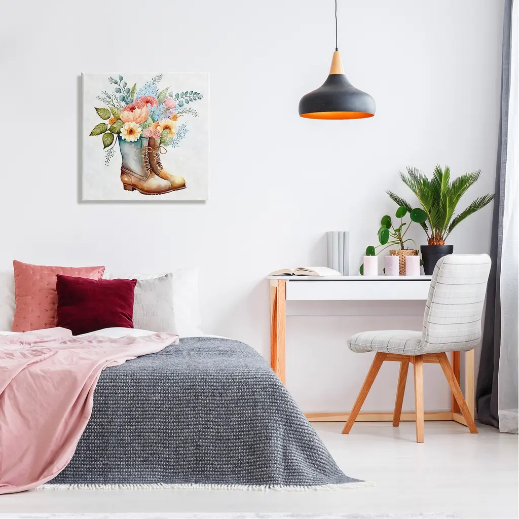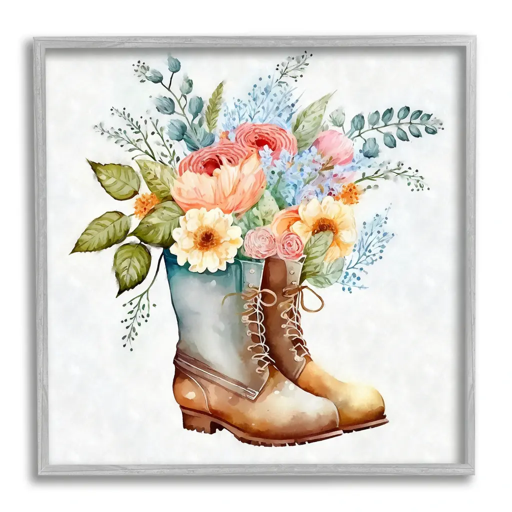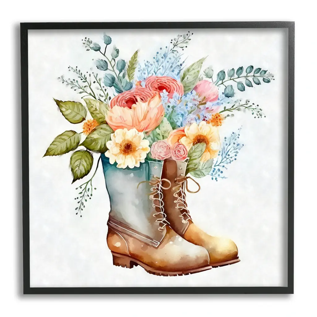 We create our stretched canvas to the highest standards. Using only the highest quality inks and canvas on Mimaki printers, we hand-cut and stretch each piece over a 1.5-inch thick wooden frame for hanging. As a result, the art comes ready to hang on the sturdy ledge with no installation required. Stupell Wall Art is made in the USA.Features: Dimensions: 17 x 1.5 x 17 InchesStretched Canvas Sizes Include Standard: 17 x 1.5 x 17 Large: 24 x 1.5 x 24 X-Large: 30 x 1.5 x 30 Oversized: 36 x 1.5 x 36Wall Art is Ready to Hang - No Installation or Hardware Needed. For Easy Set Up Lean or Layer Artwork on Shelf or Against Wall.Our stretched canvas is created with the highest standards. We use only the highest quality inks and canvas on our in house Mimaki printers, and then hand cut and stretch each piece over a 1.5 inch thick wooden frame for hanging. Made In USA.Artwork Relates To: Floral, Flower, Flower Arrangement, Flower Bouquet, Plant, Boot, GardeningDesign by Ziwei Li