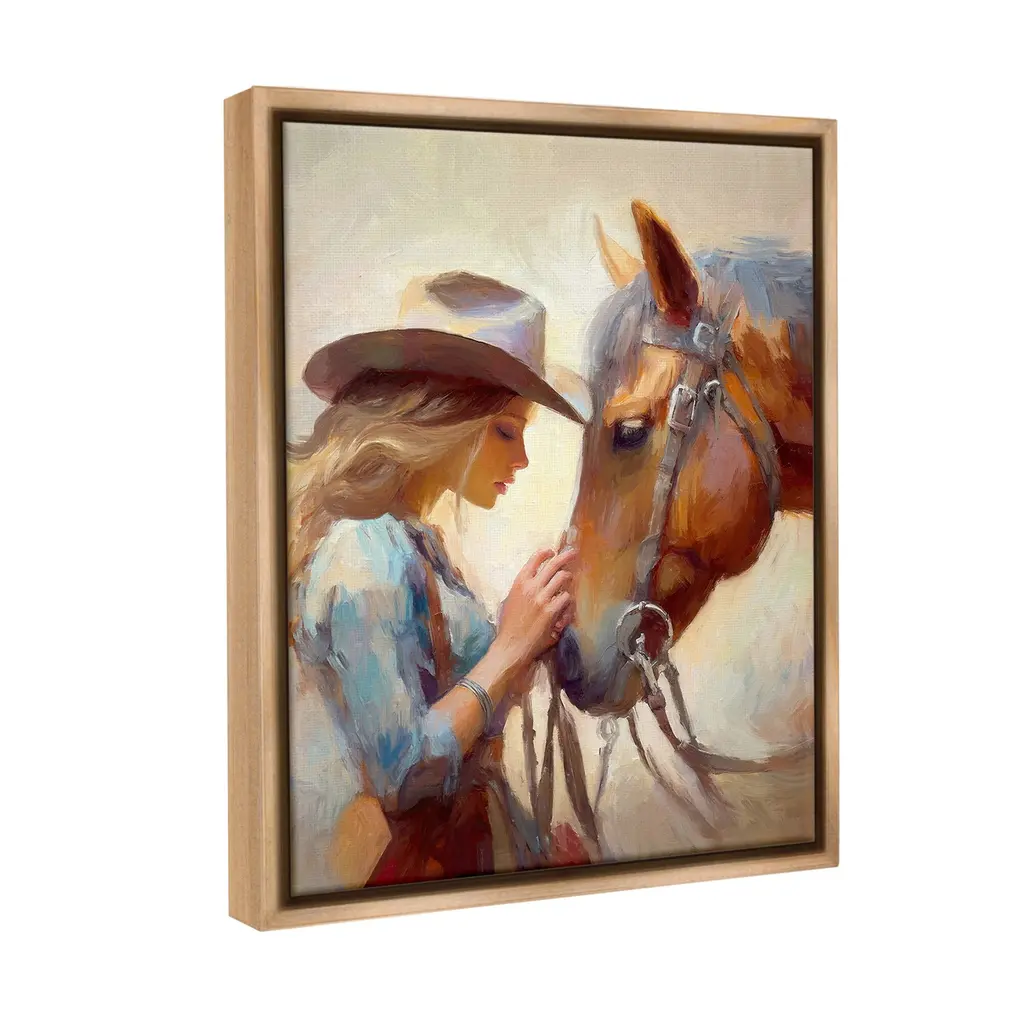 Elevate your home or office to the next level with Stupell Framed Floating Canvas Wall Art. Our premium hand-stretched canvas is mounted securely into a sturdy lightweight frame. The museum-style gap between the wrapped canvas and the box frame gives the illusion of floating artwork. Stupell Wall Art is made in the USA.Features: Dimensions: 17 x 1.7 x 21 Frame, 16 x 1.5 x 20 Canvas ArtFloating Frame Canvas Products are available in sizes 17"x21" and 25"x31". All Floating Frame Canvas Products have a 1.7" Depth.Wall Art is Ready to Hang with Hardware Free Hanging. No Installation required. For Easy Set Up Lean or Layer Artwork on Shelf or Against Wall. Artwork is Permently Fixed into the Frame.Our elevated 1.7" Thick Floating Frame is the perfect complement to our canvas style Wall Art. We use only the highest quality inks in house with industry leading printing solutions. Canvas is hand stretched over a durable wood foundation and then mounted securly into a Modern Box Frame. Made in the USA.Artwork Relates To: Animal, Horse, Mammal, Person, Woman, Horse, Cowgirl, Southwester, Country, FarmDesign by Ramona Murdock