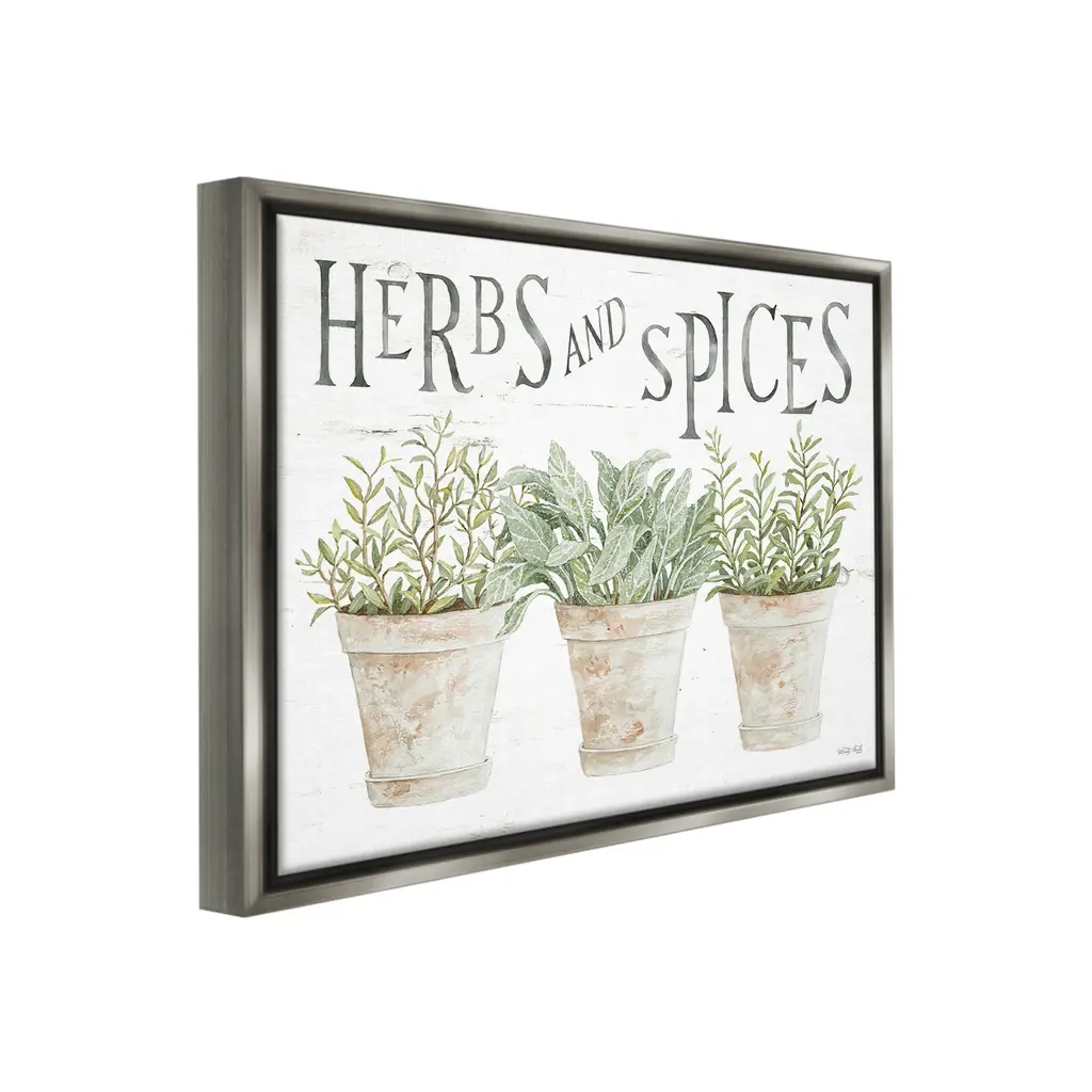 Elevate your home or office to the next level with Stupell Framed Floating Canvas Wall Art. Our premium hand-stretched canvas is mounted securely into a sturdy lightweight frame. The museum-style gap between the wrapped canvas and the box frame gives the illusion of floating artwork. Stupell Wall Art is made in the USA.Features: Dimensions: 21 x 1.7 x 17 Frame, 20 x 1.5 x 16 Canvas ArtFloating Frame Canvas Products are available in sizes 21"x17" and 31"x25". All Floating Frame Canvas Products have a 1.7" Depth.Wall Art is Ready to Hang with Hardware Free Hanging. No Installation required. For Easy Set Up Lean or Layer Artwork on Shelf or Against Wall. Artwork is Permently Fixed into the Frame.Our elevated 1.7" Thick Floating Frame is the perfect complement to our canvas style Wall Art. We use only the highest quality inks in house with industry leading printing solutions. Canvas is hand stretched over a durable wood foundation and then mounted securly into a Modern Box Frame. Made in the USA.Artwork Relates To: Herbal, Herbs, Plant, Leaf, Potted Plant, Flower, Planter, Garden, Country, Rustic, Herbs and SpicesDesign by Cindy Jacobs