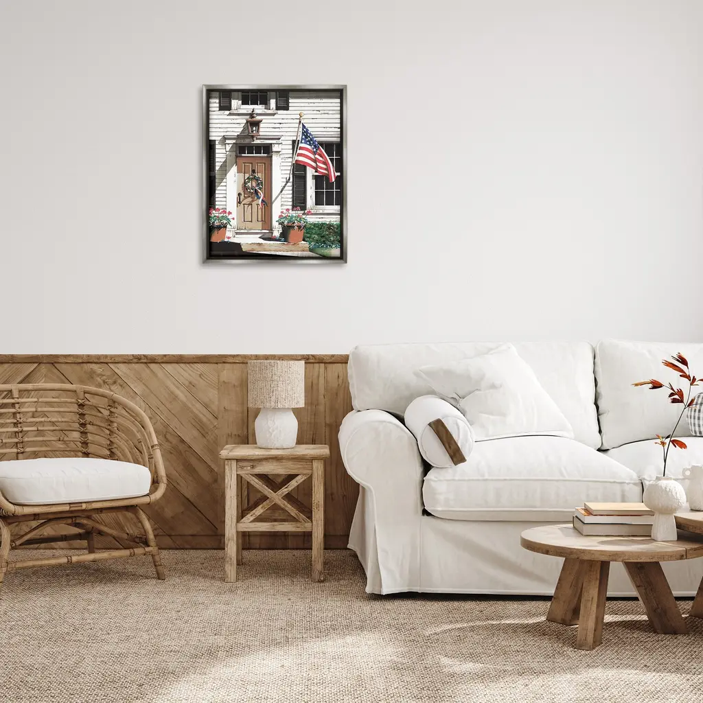Elevate your home or office to the next level with Stupell Framed Floating Canvas Wall Art. Our premium hand-stretched canvas is mounted securely into a sturdy lightweight frame. The museum-style gap between the wrapped canvas and the box frame gives the illusion of floating artwork. Stupell Wall Art is made in the USA.Features: Dimensions: 17 x 1.7 x 21 Frame, 16 x 1.5 x 20 Canvas ArtFloating Frame Canvas Products are available in sizes 17"x21" and 25"x31". All Floating Frame Canvas Products have a 1.7" Depth.Wall Art is Ready to Hang with Hardware Free Hanging. No Installation required. For Easy Set Up Lean or Layer Artwork on Shelf or Against Wall. Artwork is Permently Fixed into the Frame.Our elevated 1.7" Thick Floating Frame is the perfect complement to our canvas style Wall Art. We use only the highest quality inks in house with industry leading printing solutions. Canvas is hand stretched over a durable wood foundation and then mounted securly into a Modern Box Frame. Made in the USA.Artwork Relates To: Plant, Potted Plant, Planter, Flower, Flag, American Flag, House, Doorway, Wreath, Americana, Country, FarmhouseDesign by John Rossini