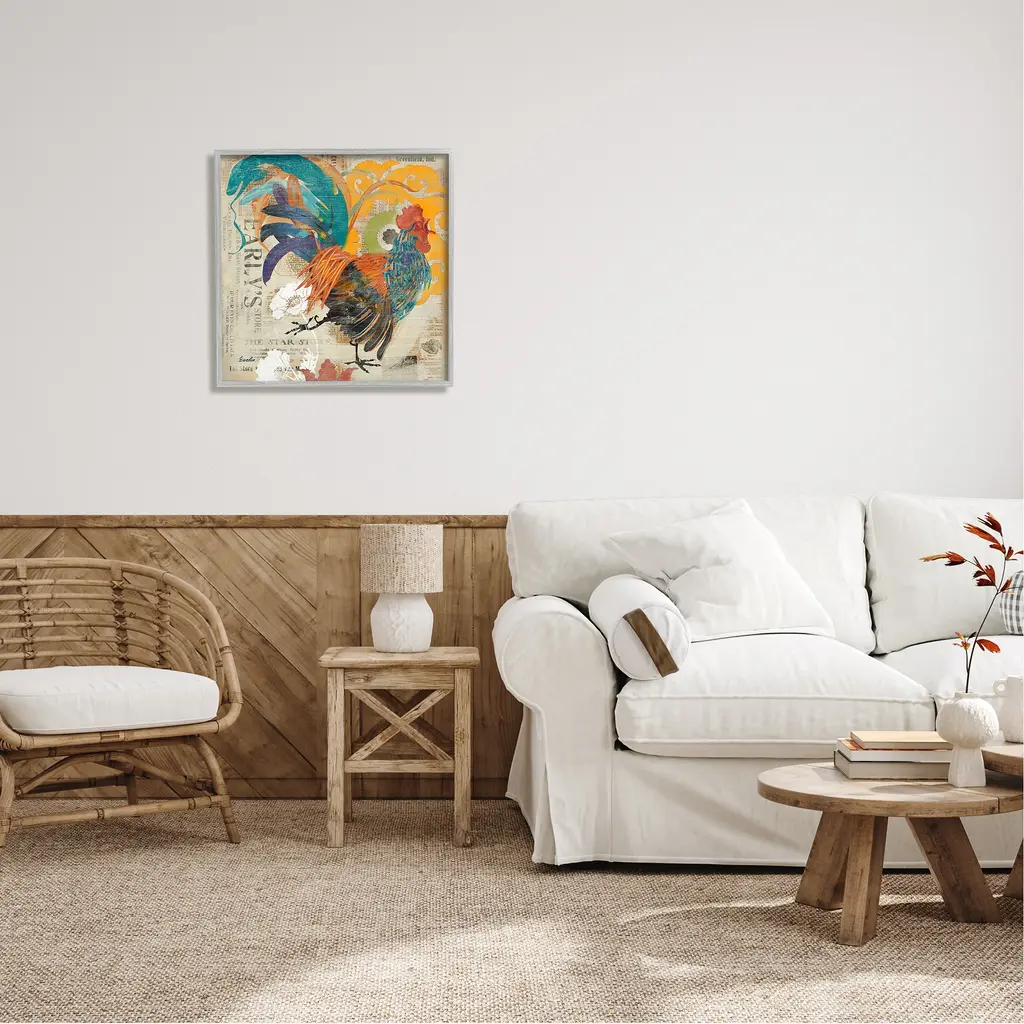 Our Framed Giclee Wall Art adds a touch of class to any space in your home or office. Frames are available in three alluring styles: black, gray farmhouse and white. Our textured artwork will add more depth and dimension to any space. Each piece is mounted with a 1.5 inch thick wood grain frame that is ready to hang! Looking for a statement piece? We have oversized artwork available. Room Type: Living Room, Den, Hallway, Office, Entryway, Study, Dining Room or Bedroom, Guest Room, Studio, Dorm or BoudoirFeatures: Dimensions: 12 x 1.5 x 12 FramedFramed Giclee Sizes Include Standard: 12 x 1.5 x 12 Large: 17 x 1.5 x 17 Oversized: 24 x 1.5 x 24Wall Art is Ready to Hang - No Installation or Hardware Needed. For Easy Set Up Lean or Layer Artwork on Shelf or Against Wall.Our giclée prints are carefully mounted on a durable MDF backing, and then perfectly finished in a 1.5 inch thick woodgrain frame. Mounted frame colors include black, gray farmhouse and white. Made In USA.Artwork Relates To: Animal, Bird, Chicken, Rooster, Vintage, Collage, FloralDesign by Evelia Designs