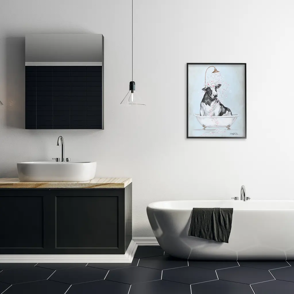 Add dimension to any room with our textured Framed Giclee Artwork. Our framed artwork is securely mounted into a 1.5-inch thick wood grain frame and ready to hang. Frames are available in three alluring styles: black, gray farmhouse and white. In addition, you should check out our oversized options if you want a statement piece. Stupell Wall Art is made in the USA.Features: Dimensions: 11 x 1.5 x 14 FramedFramed Giclee Products are available in the sizes 11"x14", 16"x20" or 24"x30". All Framed Giclee Products have a 1.5" Depth. Wall Art is Ready to Hang with Hardware Free Hanging. No installation required. For Easy Set Up Lean or Layer Artwork on Shelf or Against Wall.Our giclée prints are carefully mounted on a durable MDF backing, and then perfectly finished in a 1.5 inch thick woodgrain frame. Mounted frame colors include black, gray farmhouse and white. Made In USA.Artwork Relates To: Bathroom, Animal, Mammal, Bathtub, Tub, Flower, Cattle, Cow, RusticDesign by Deb Coules