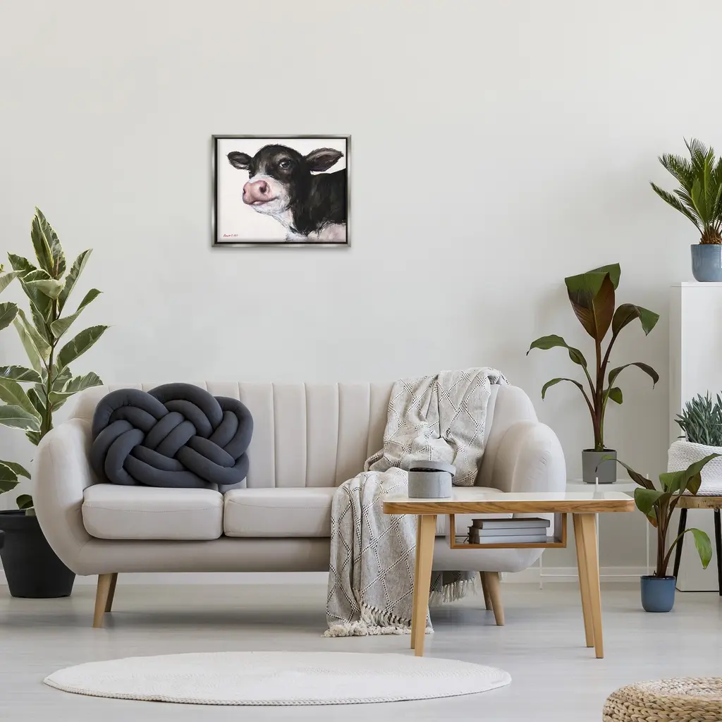 Elevate your home or office to the next level with Stupell Framed Floating Canvas Wall Art. Our premium hand-stretched canvas is mounted securely into a sturdy lightweight frame. The museum-style gap between the wrapped canvas and the box frame gives the illusion of floating artwork. Stupell Wall Art is made in the USA.Features: Dimensions: 21 x 1.7 x 17 Frame, 20 x 1.5 x 16 Canvas ArtFloating Frame Canvas Products are available in sizes 21"x17" and 31"x25". All Floating Frame Canvas Products have a 1.7" Depth.Wall Art is Ready to Hang with Hardware Free Hanging. No Installation required. For Easy Set Up Lean or Layer Artwork on Shelf or Against Wall. Artwork is Permently Fixed into the Frame.Our elevated 1.7" Thick Floating Frame is the perfect complement to our canvas style Wall Art. We use only the highest quality inks in house with industry leading printing solutions. Canvas is hand stretched over a durable wood foundation and then mounted securly into a Modern Box Frame. Made in the USA.Artwork Relates To: Animal, Cattle, Cow, Mammal, Calf, Minimal, Farm, Country, PaintingDesign by GeorgeDyachenkoArt