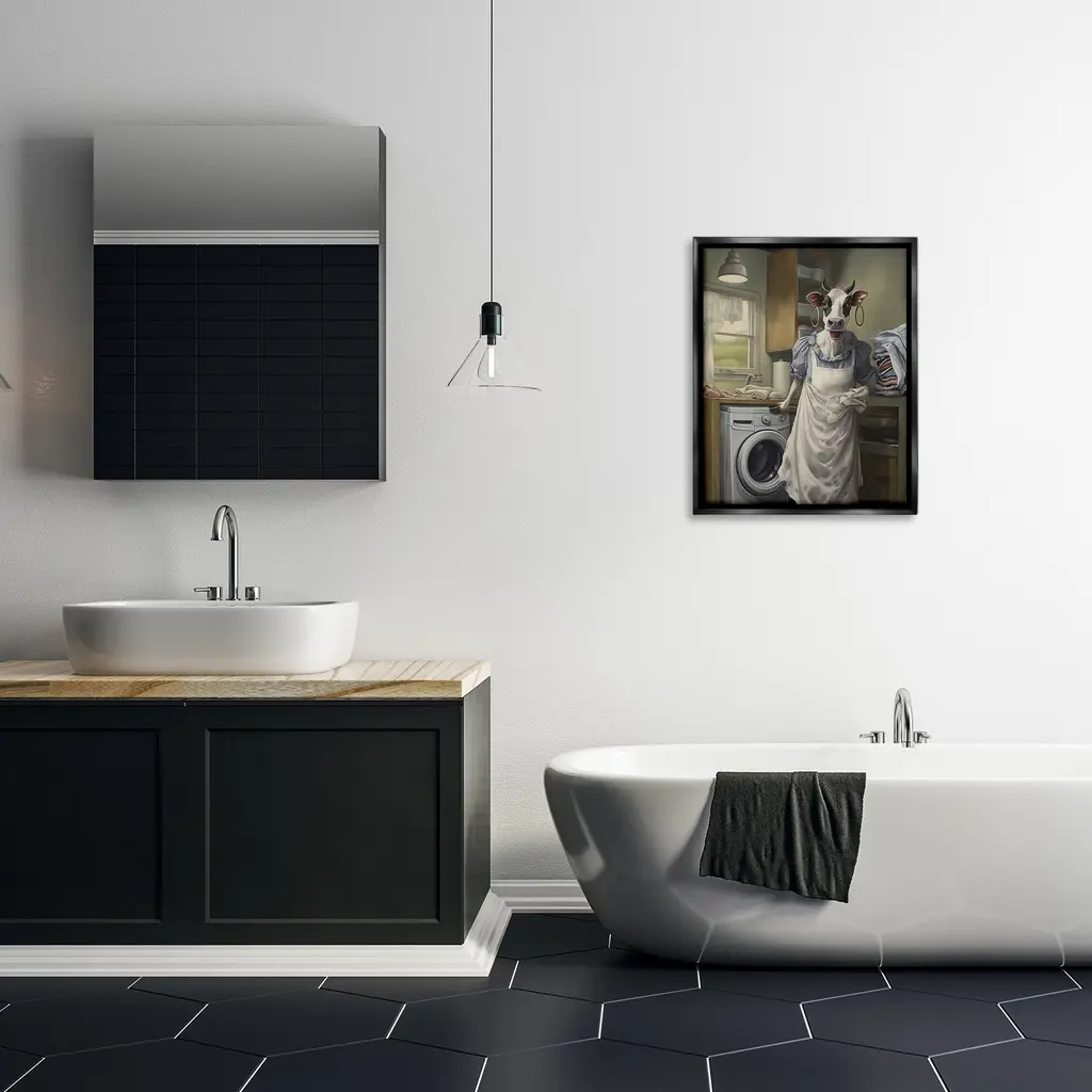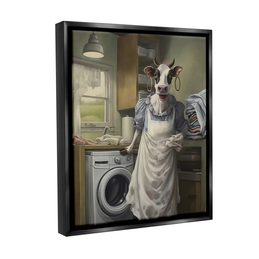 Elevate your home or office to the next level with Stupell Framed Floating Canvas Wall Art. Our premium hand-stretched canvas is mounted securely into a sturdy lightweight frame. The museum-style gap between the wrapped canvas and the box frame gives the illusion of floating artwork. Stupell Wall Art is made in the USA.Features: Dimensions: 17 x 1.7 x 21 Frame, 16 x 1.5 x 20 Canvas ArtFloating Frame Canvas Products are available in sizes 17"x21" and 25"x31". All Floating Frame Canvas Products have a 1.7" Depth.Wall Art is Ready to Hang with Hardware Free Hanging. No Installation required. For Easy Set Up Lean or Layer Artwork on Shelf or Against Wall. Artwork is Permently Fixed into the Frame.Our elevated 1.7" Thick Floating Frame is the perfect complement to our canvas style Wall Art. We use only the highest quality inks in house with industry leading printing solutions. Canvas is hand stretched over a durable wood foundation and then mounted securly into a Modern Box Frame. Made in the USA.Artwork Relates To: Appliance, Washer, Laundry, Cow, Cattle, Farmhouse, HumorDesign by PSL Art