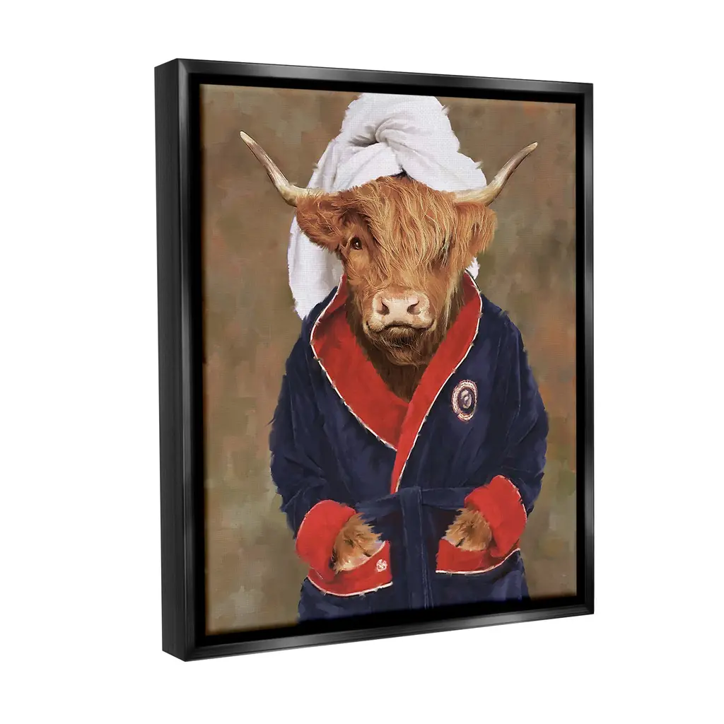 Elevate your home or office to the next level with Stupell Framed Floating Canvas Wall Art. Our premium hand-stretched canvas is mounted securely into a sturdy lightweight frame. The museum-style gap between the wrapped canvas and the box frame gives the illusion of floating artwork. Stupell Wall Art is made in the USA.Features: Dimensions: 17 x 1.7 x 21 Frame, 16 x 1.5 x 20 Canvas ArtFloating Frame Canvas Products are available in sizes 17"x21" and 25"x31". All Floating Frame Canvas Products have a 1.7" Depth.Wall Art is Ready to Hang with Hardware Free Hanging. No Installation required. For Easy Set Up Lean or Layer Artwork on Shelf or Against Wall. Artwork is Permently Fixed into the Frame.Our elevated 1.7" Thick Floating Frame is the perfect complement to our canvas style Wall Art. We use only the highest quality inks in house with industry leading printing solutions. Canvas is hand stretched over a durable wood foundation and then mounted securly into a Modern Box Frame. Made in the USA.Artwork Relates To: Animal, Mammal, Cattle, Cow, Bathroom, Bathing, Towel, RobeDesign by PSL Art