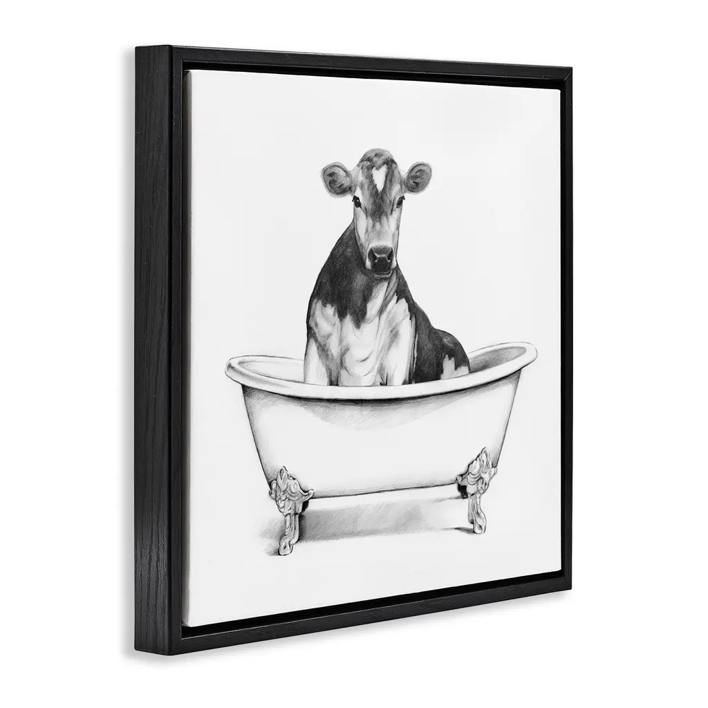 Elevate your home or office to the next level with Stupell Framed Floating Canvas Wall Art. Our premium hand-stretched canvas is mounted securely into a sturdy lightweight frame. The museum-style gap between the wrapped canvas and the box frame gives the illusion of floating artwork. Stupell Wall Art is made in the USA.Features: Dimensions: 18 x 1.7 x 18 Frame, 17 x 1.5 x 17 Canvas ArtFloating Frame Canvas Products are available in sizes 18"x18" and 25"x25". All Floating Frame Canvas Products have a 1.7" Depth.Wall Art is Ready to Hang with Hardware Free Hanging. No Installation required. For Easy Set Up Lean or Layer Artwork on Shelf or Against Wall. Artwork is Permently Fixed into the Frame.Our elevated 1.7" Thick Floating Frame is the perfect complement to our canvas style Wall Art. We use only the highest quality inks in house with industry leading printing solutions. Canvas is hand stretched over a durable wood foundation and then mounted securly into a Modern Box Frame. Made in the USA.Artwork Relates To: Bathroom, Bathtub, Animal, CowDesign by Victoria Borges