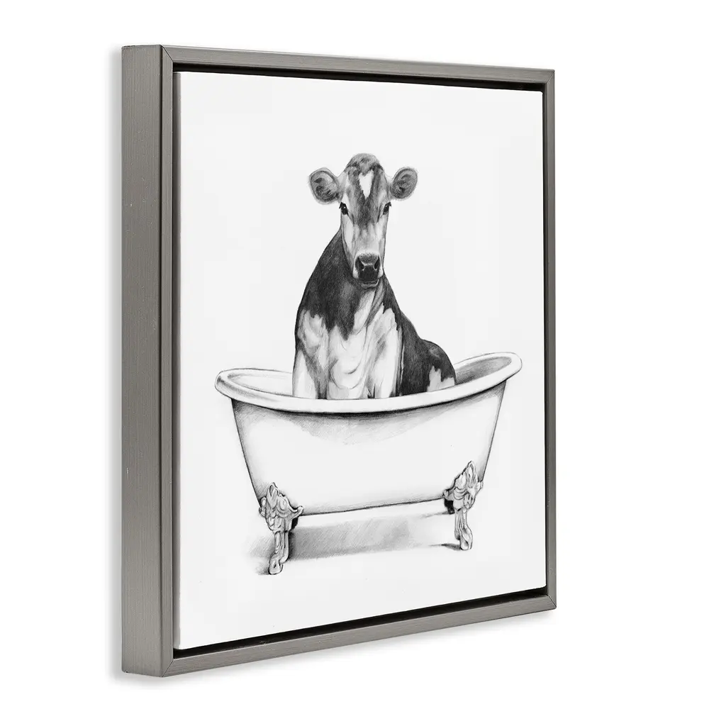 Elevate your home or office to the next level with Stupell Framed Floating Canvas Wall Art. Our premium hand-stretched canvas is mounted securely into a sturdy lightweight frame. The museum-style gap between the wrapped canvas and the box frame gives the illusion of floating artwork. Stupell Wall Art is made in the USA.Features: Dimensions: 18 x 1.7 x 18 Frame, 17 x 1.5 x 17 Canvas ArtFloating Frame Canvas Products are available in sizes 18"x18" and 25"x25". All Floating Frame Canvas Products have a 1.7" Depth.Wall Art is Ready to Hang with Hardware Free Hanging. No Installation required. For Easy Set Up Lean or Layer Artwork on Shelf or Against Wall. Artwork is Permently Fixed into the Frame.Our elevated 1.7" Thick Floating Frame is the perfect complement to our canvas style Wall Art. We use only the highest quality inks in house with industry leading printing solutions. Canvas is hand stretched over a durable wood foundation and then mounted securly into a Modern Box Frame. Made in the USA.Artwork Relates To: Bathroom, Bathtub, Animal, CowDesign by Victoria Borges
