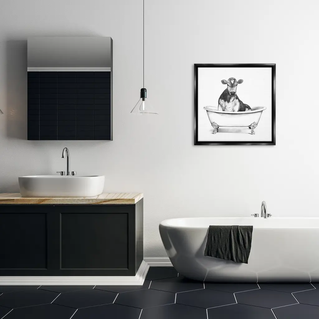 Elevate your home or office to the next level with Stupell Framed Floating Canvas Wall Art. Our premium hand-stretched canvas is mounted securely into a sturdy lightweight frame. The museum-style gap between the wrapped canvas and the box frame gives the illusion of floating artwork. Stupell Wall Art is made in the USA.Features: Dimensions: 18 x 1.7 x 18 Frame, 17 x 1.5 x 17 Canvas ArtFloating Frame Canvas Products are available in sizes 18"x18" and 25"x25". All Floating Frame Canvas Products have a 1.7" Depth.Wall Art is Ready to Hang with Hardware Free Hanging. No Installation required. For Easy Set Up Lean or Layer Artwork on Shelf or Against Wall. Artwork is Permently Fixed into the Frame.Our elevated 1.7" Thick Floating Frame is the perfect complement to our canvas style Wall Art. We use only the highest quality inks in house with industry leading printing solutions. Canvas is hand stretched over a durable wood foundation and then mounted securly into a Modern Box Frame. Made in the USA.Artwork Relates To: Bathroom, Bathtub, Animal, CowDesign by Victoria Borges
