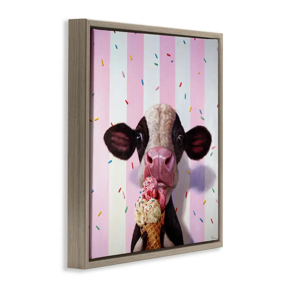 Elevate your home or office to the next level with Stupell Framed Floating Canvas Wall Art. Our premium hand-stretched canvas is mounted securely into a sturdy lightweight frame. The museum-style gap between the wrapped canvas and the box frame gives the illusion of floating artwork. Stupell Wall Art is made in the USA.Features: Dimensions: 18 x 1.7 x 18 Frame, 17 x 1.5 x 17 Canvas ArtFloating Frame Canvas Products are available in sizes 18"x18" and 25"x25". All Floating Frame Canvas Products have a 1.7" Depth.Wall Art is Ready to Hang with Hardware Free Hanging. No Installation required. For Easy Set Up Lean or Layer Artwork on Shelf or Against Wall. Artwork is Permently Fixed into the Frame.Our elevated 1.7" Thick Floating Frame is the perfect complement to our canvas style Wall Art. We use only the highest quality inks in house with industry leading printing solutions. Canvas is hand stretched over a durable wood foundation and then mounted securly into a Modern Box Frame. Made in the USA.Artwork Relates To: Kitchen, Humor, Animal, Cow, Ice Cream, Dairy, Stripes, PatternDesign by Lucia Heffernan