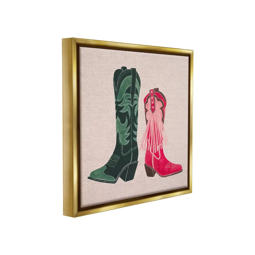 Elevate your home or office to the next level with Stupell Framed Floating Canvas Wall Art. Our premium hand-stretched canvas is mounted securely into a sturdy lightweight frame. The museum-style gap between the wrapped canvas and the box frame gives the illusion of floating artwork. Stupell Wall Art is made in the USA.Features: Dimensions: 18 x 1.7 x 18 Frame, 17 x 1.5 x 17 Canvas ArtFloating Frame Canvas Products are available in sizes 18"x18" and 25"x25". All Floating Frame Canvas Products have a 1.7" Depth.Wall Art is Ready to Hang with Hardware Free Hanging. No Installation required. For Easy Set Up Lean or Layer Artwork on Shelf or Against Wall. Artwork is Permently Fixed into the Frame.Our elevated 1.7" Thick Floating Frame is the perfect complement to our canvas style Wall Art. We use only the highest quality inks in house with industry leading printing solutions. Canvas is hand stretched over a durable wood foundation and then mounted securly into a Modern Box Frame. Made in the USA.Artwork Relates To: Equestrian, Rodeo, Country, Southwestern, Cowboy, Cowgirl, Cowboy BootDesign by Grace Popp