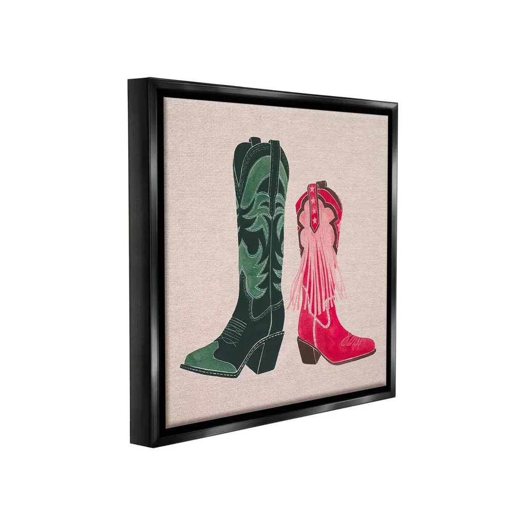 Elevate your home or office to the next level with Stupell Framed Floating Canvas Wall Art. Our premium hand-stretched canvas is mounted securely into a sturdy lightweight frame. The museum-style gap between the wrapped canvas and the box frame gives the illusion of floating artwork. Stupell Wall Art is made in the USA.Features: Dimensions: 18 x 1.7 x 18 Frame, 17 x 1.5 x 17 Canvas ArtFloating Frame Canvas Products are available in sizes 18"x18" and 25"x25". All Floating Frame Canvas Products have a 1.7" Depth.Wall Art is Ready to Hang with Hardware Free Hanging. No Installation required. For Easy Set Up Lean or Layer Artwork on Shelf or Against Wall. Artwork is Permently Fixed into the Frame.Our elevated 1.7" Thick Floating Frame is the perfect complement to our canvas style Wall Art. We use only the highest quality inks in house with industry leading printing solutions. Canvas is hand stretched over a durable wood foundation and then mounted securly into a Modern Box Frame. Made in the USA.Artwork Relates To: Equestrian, Rodeo, Country, Southwestern, Cowboy, Cowgirl, Cowboy BootDesign by Grace Popp