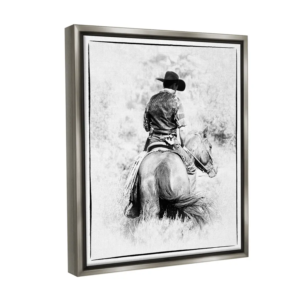 Elevate your home or office to the next level with Stupell Framed Floating Canvas Wall Art. Our premium hand-stretched canvas is mounted securely into a sturdy lightweight frame. The museum-style gap between the wrapped canvas and the box frame gives the illusion of floating artwork. Stupell Wall Art is made in the USA.Features: Dimensions: 17 x 1.7 x 21 Frame, 16 x 1.5 x 20 Canvas ArtFloating Frame Canvas Products are available in sizes 17"x21" and 25"x31". All Floating Frame Canvas Products have a 1.7" Depth.Wall Art is Ready to Hang with Hardware Free Hanging. No Installation required. For Easy Set Up Lean or Layer Artwork on Shelf or Against Wall. Artwork is Permently Fixed into the Frame.Our elevated 1.7" Thick Floating Frame is the perfect complement to our canvas style Wall Art. We use only the highest quality inks in house with industry leading printing solutions. Canvas is hand stretched over a durable wood foundation and then mounted securly into a Modern Box Frame. Made in the USA.Artwork Relates To: Animal, Horse, Mammal, Saddle, Equestrian, Person, Rodeo, Country, Southwestern, Cowboy, MonochromeDesign by Jerry Cowart