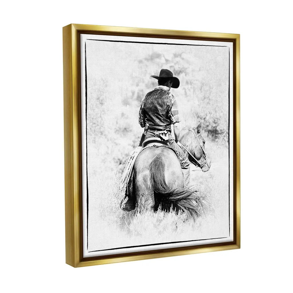 Elevate your home or office to the next level with Stupell Framed Floating Canvas Wall Art. Our premium hand-stretched canvas is mounted securely into a sturdy lightweight frame. The museum-style gap between the wrapped canvas and the box frame gives the illusion of floating artwork. Stupell Wall Art is made in the USA.Features: Dimensions: 17 x 1.7 x 21 Frame, 16 x 1.5 x 20 Canvas ArtFloating Frame Canvas Products are available in sizes 17"x21" and 25"x31". All Floating Frame Canvas Products have a 1.7" Depth.Wall Art is Ready to Hang with Hardware Free Hanging. No Installation required. For Easy Set Up Lean or Layer Artwork on Shelf or Against Wall. Artwork is Permently Fixed into the Frame.Our elevated 1.7" Thick Floating Frame is the perfect complement to our canvas style Wall Art. We use only the highest quality inks in house with industry leading printing solutions. Canvas is hand stretched over a durable wood foundation and then mounted securly into a Modern Box Frame. Made in the USA.Artwork Relates To: Animal, Horse, Mammal, Saddle, Equestrian, Person, Rodeo, Country, Southwestern, Cowboy, MonochromeDesign by Jerry Cowart