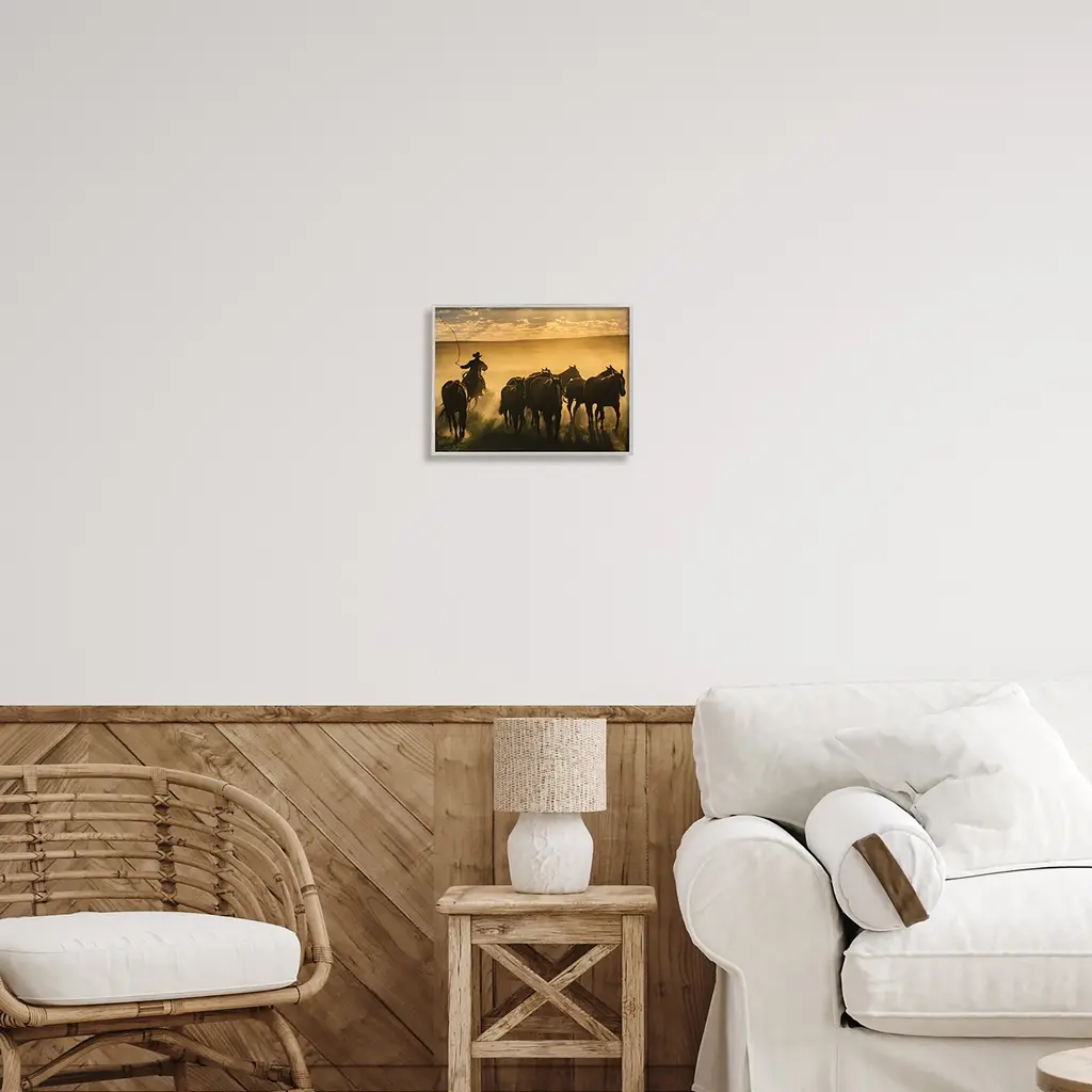 Stupell Cowboy & Horses At Sunset Framed Giclee Art Design By Pburchettephoto - 14 X 11 - Grey
