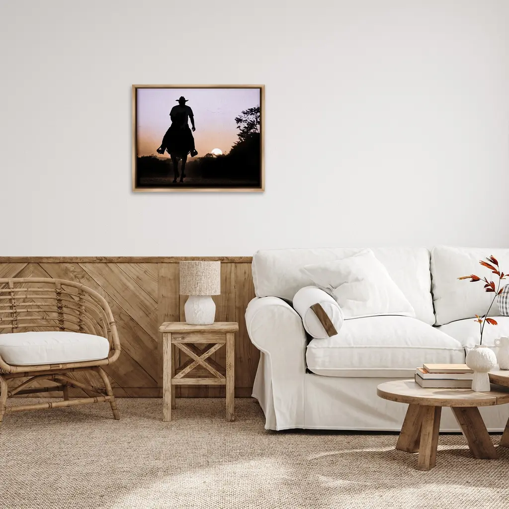 Elevate your home or office to the next level with Stupell Framed Floating Canvas Wall Art. Our premium hand-stretched canvas is mounted securely into a sturdy lightweight frame. The museum-style gap between the wrapped canvas and the box frame gives the illusion of floating artwork. Stupell Wall Art is made in the USA.Features: Dimensions: 21 x 1.7 x 17 Frame, 20 x 1.5 x 16 Canvas ArtFloating Frame Canvas Products are available in sizes 21"x17" and 31"x25". All Floating Frame Canvas Products have a 1.7" Depth.Wall Art is Ready to Hang with Hardware Free Hanging. No Installation required. For Easy Set Up Lean or Layer Artwork on Shelf or Against Wall. Artwork is Permently Fixed into the Frame.Our elevated 1.7" Thick Floating Frame is the perfect complement to our canvas style Wall Art. We use only the highest quality inks in house with industry leading printing solutions. Canvas is hand stretched over a durable wood foundation and then mounted securly into a Modern Box Frame. Made in the USA.Artwork Relates To: Equestrian, Rodeo, Country, Southwestern, Cowgirl, Animal, Horse, Silhouette, Photography, Moon, SunDesign by Marcus Prime