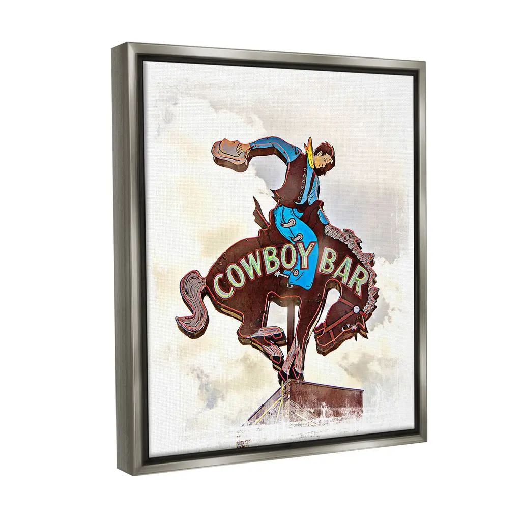 Elevate your home or office to the next level with Stupell Framed Floating Canvas Wall Art. Our premium hand-stretched canvas is mounted securely into a sturdy lightweight frame. The museum-style gap between the wrapped canvas and the box frame gives the illusion of floating artwork. Stupell Wall Art is made in the USA.Features: Dimensions: 17 x 1.7 x 21 Frame, 16 x 1.5 x 20 Canvas ArtFloating Frame Canvas Products are available in sizes 17"x21" and 25"x31". All Floating Frame Canvas Products have a 1.7" Depth.Wall Art is Ready to Hang with Hardware Free Hanging. No Installation required. For Easy Set Up Lean or Layer Artwork on Shelf or Against Wall. Artwork is Permently Fixed into the Frame.Our elevated 1.7" Thick Floating Frame is the perfect complement to our canvas style Wall Art. We use only the highest quality inks in house with industry leading printing solutions. Canvas is hand stretched over a durable wood foundation and then mounted securly into a Modern Box Frame. Made in the USA.Artwork Relates To: Animal, Horse, Mammal, Saddle, Equestrian, Person, Rodeo, Country, Southwestern, Cowboy, Sign, Bar, LiquorDesign by Jerry Cowart