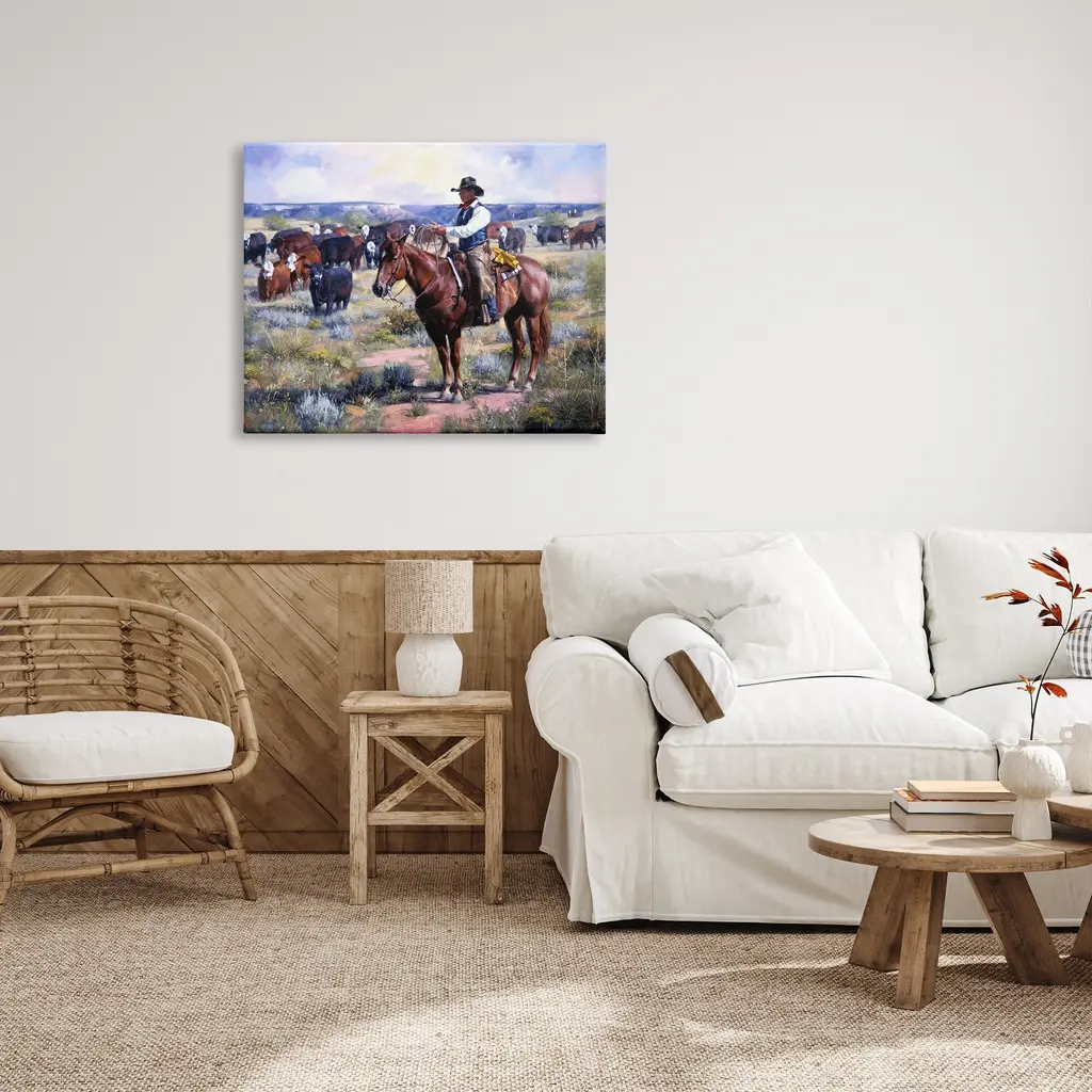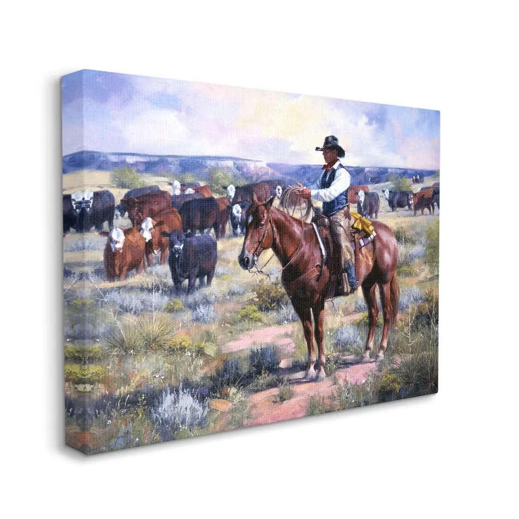 We create our stretched canvas to the highest standards. Using only the highest quality inks and canvas on Mimaki printers, we hand-cut and stretch each piece over a 1.5-inch thick wooden frame for hanging. As a result, the art comes ready to hang on the sturdy ledge with no installation required. Stupell Wall Art is made in the USA.Features: Dimensions: 20 x 1.5 x 16 InchesStretched Canvas Sizes Include Standard: 20 x 1.5 x 16 Large: 30 x 1.5 x 20 X-Large: 40 x 1.5 x 30 Oversized: 48 x 1.5 x 36Wall Art is Ready to Hang with Hardware Free Hanging. No installation required. For Easy Set Up Lean or Layer Artwork on Shelf or Against Wall.Our stretched canvas is created with the highest standards. We use only the highest quality inks and canvas on our in house Mimaki printers, and then hand cut and stretch each piece over a 1.5 inch thick wooden frame for hanging. Made In USA.Artwork Relates To: Painting, Nature, Person, Animal, Horse, Mammal, Horseback Riding, Countryside, Southwestern, Country, CowboyDesign by Jack Sorenson
