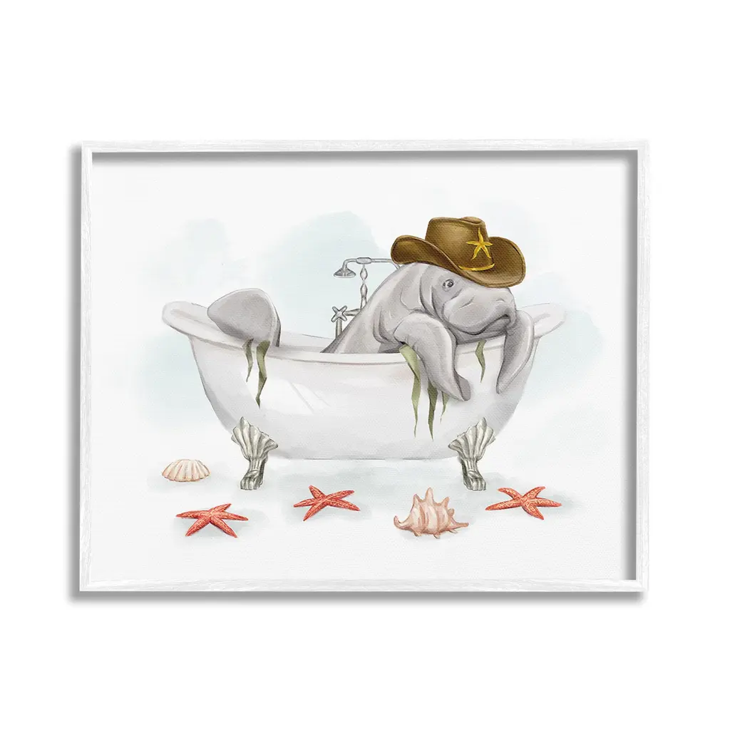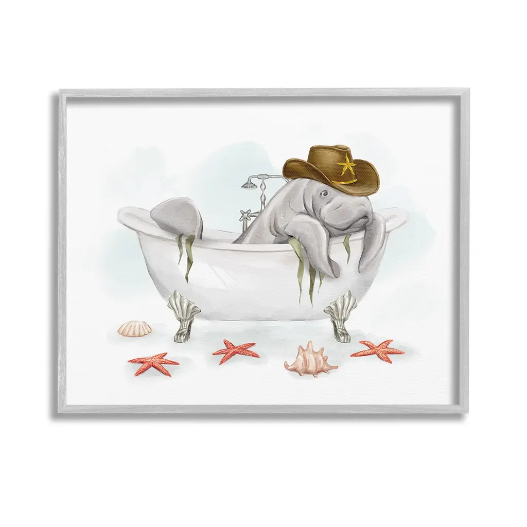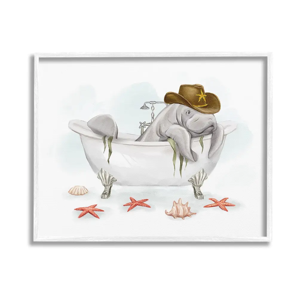 Elevate your home or office to the next level with Stupell Framed Floating Canvas Wall Art. Our premium hand-stretched canvas is mounted securely into a sturdy lightweight frame. The museum-style gap between the wrapped canvas and the box frame gives the illusion of floating artwork. Stupell Wall Art is made in the USA.Features: Dimensions: 21 x 1.7 x 17 Frame, 20 x 1.5 x 16 Canvas ArtFloating Frame Canvas Products are available in sizes 21"x17" and 31"x25". All Floating Frame Canvas Products have a 1.7" Depth.Wall Art is Ready to Hang with Hardware Free Hanging. No Installation required. For Easy Set Up Lean or Layer Artwork on Shelf or Against Wall. Artwork is Permently Fixed into the Frame.Our elevated 1.7" Thick Floating Frame is the perfect complement to our canvas style Wall Art. We use only the highest quality inks in house with industry leading printing solutions. Canvas is hand stretched over a durable wood foundation and then mounted securly into a Modern Box Frame. Made in the USA.Artwork Relates To: Tub, Bathing, Bathtub, Bathroom, Animal, Sea Life, Nautical, Marine, Manatee, Cowboy, Starfish, SeashellDesign by Ziwei Li