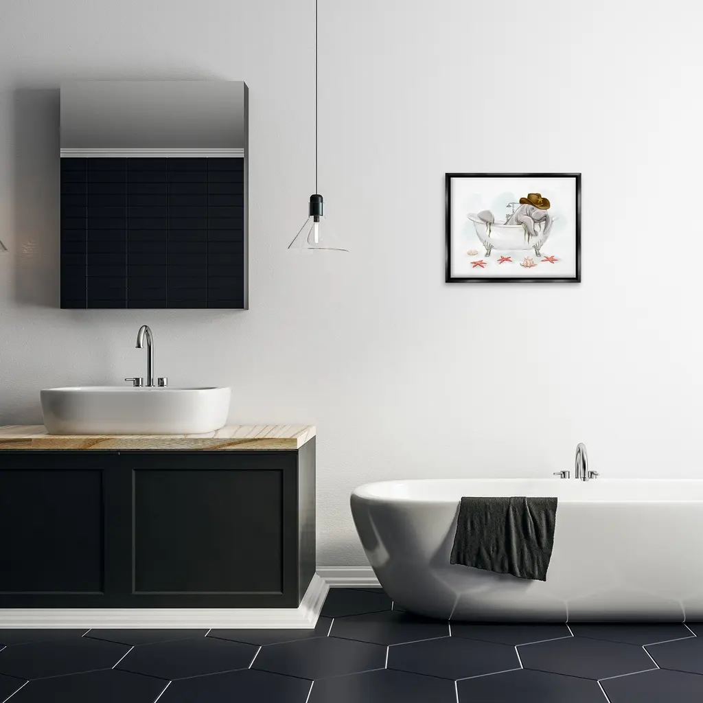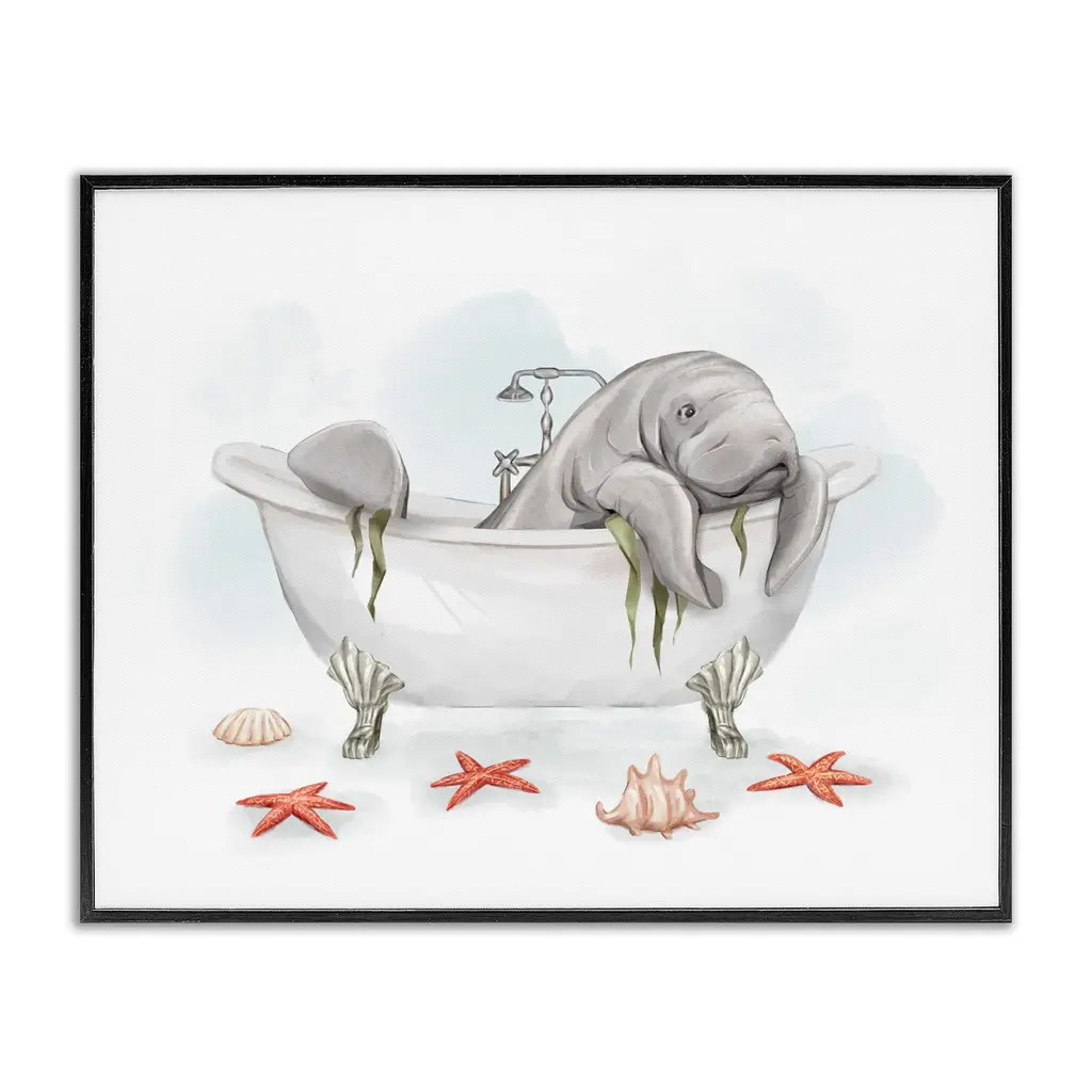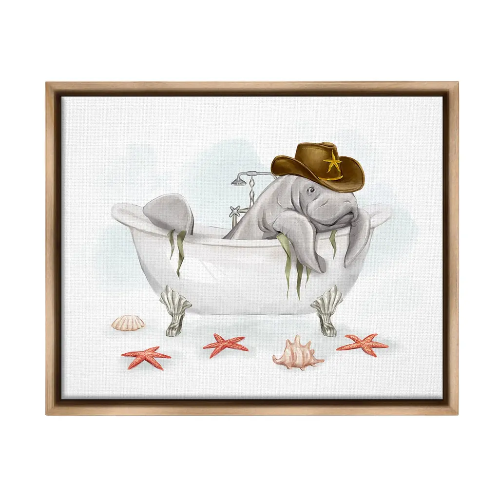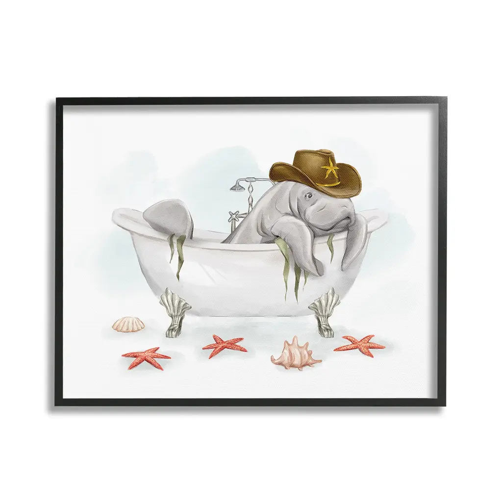 Elevate your home or office to the next level with Stupell Framed Floating Canvas Wall Art. Our premium hand-stretched canvas is mounted securely into a sturdy lightweight frame. The museum-style gap between the wrapped canvas and the box frame gives the illusion of floating artwork. Stupell Wall Art is made in the USA.Features: Dimensions: 21 x 1.7 x 17 Frame, 20 x 1.5 x 16 Canvas ArtFloating Frame Canvas Products are available in sizes 21"x17" and 31"x25". All Floating Frame Canvas Products have a 1.7" Depth.Wall Art is Ready to Hang with Hardware Free Hanging. No Installation required. For Easy Set Up Lean or Layer Artwork on Shelf or Against Wall. Artwork is Permently Fixed into the Frame.Our elevated 1.7" Thick Floating Frame is the perfect complement to our canvas style Wall Art. We use only the highest quality inks in house with industry leading printing solutions. Canvas is hand stretched over a durable wood foundation and then mounted securly into a Modern Box Frame. Made in the USA.Artwork Relates To: Tub, Bathing, Bathtub, Bathroom, Animal, Sea Life, Nautical, Marine, Manatee, Cowboy, Starfish, SeashellDesign by Ziwei Li