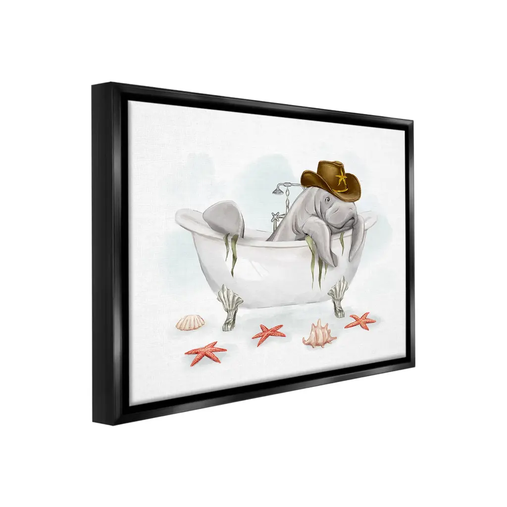 Elevate your home or office to the next level with Stupell Framed Floating Canvas Wall Art. Our premium hand-stretched canvas is mounted securely into a sturdy lightweight frame. The museum-style gap between the wrapped canvas and the box frame gives the illusion of floating artwork. Stupell Wall Art is made in the USA.Features: Dimensions: 21 x 1.7 x 17 Frame, 20 x 1.5 x 16 Canvas ArtFloating Frame Canvas Products are available in sizes 21"x17" and 31"x25". All Floating Frame Canvas Products have a 1.7" Depth.Wall Art is Ready to Hang with Hardware Free Hanging. No Installation required. For Easy Set Up Lean or Layer Artwork on Shelf or Against Wall. Artwork is Permently Fixed into the Frame.Our elevated 1.7" Thick Floating Frame is the perfect complement to our canvas style Wall Art. We use only the highest quality inks in house with industry leading printing solutions. Canvas is hand stretched over a durable wood foundation and then mounted securly into a Modern Box Frame. Made in the USA.Artwork Relates To: Tub, Bathing, Bathtub, Bathroom, Animal, Sea Life, Nautical, Marine, Manatee, Cowboy, Starfish, SeashellDesign by Ziwei Li